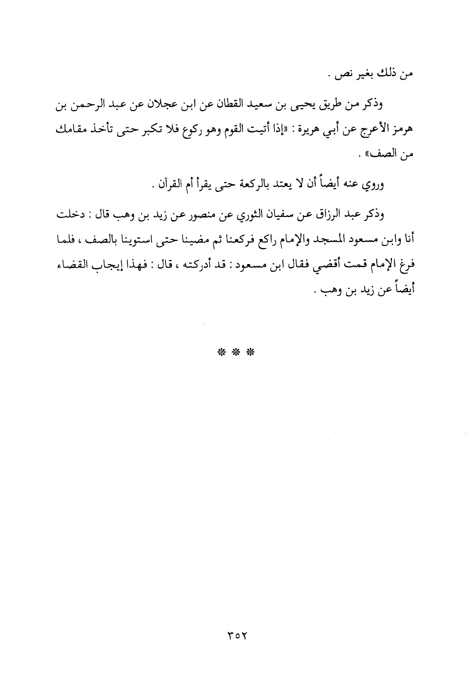 وذكر من طريق يحيى بن سعيد القطان عن ابن عجلان عن عبد الرحمن بن هرمز الأعرج عن أبي هريرة: "إذا أتيت القوم وهو ركوع فلا تكبر حتى تأخذ مقامك من الصف".