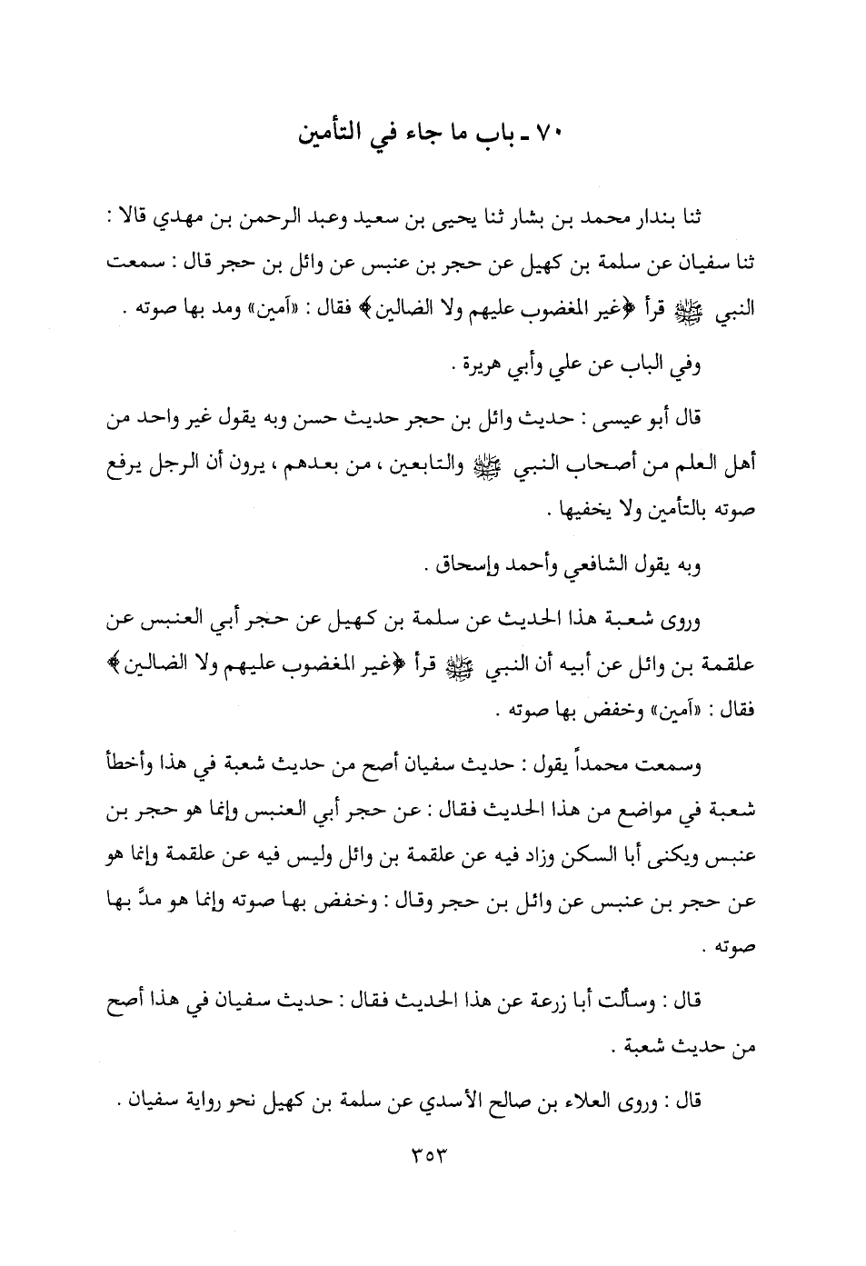 ثنا بندار محمد بن بشار ثنا يحيى بن سعيد وعبد الرحمن بن مهدي قالا: ثنا سفيان عن سلمة بن كهيل عن حجر بن عنبس عن وائل بن حجر قال: سمعت النبي - صلى الله عليه وسلم - قرأ {غير المغضوب عليهم ولا الضالين} فقال: "آمين" ومد بها صوته.