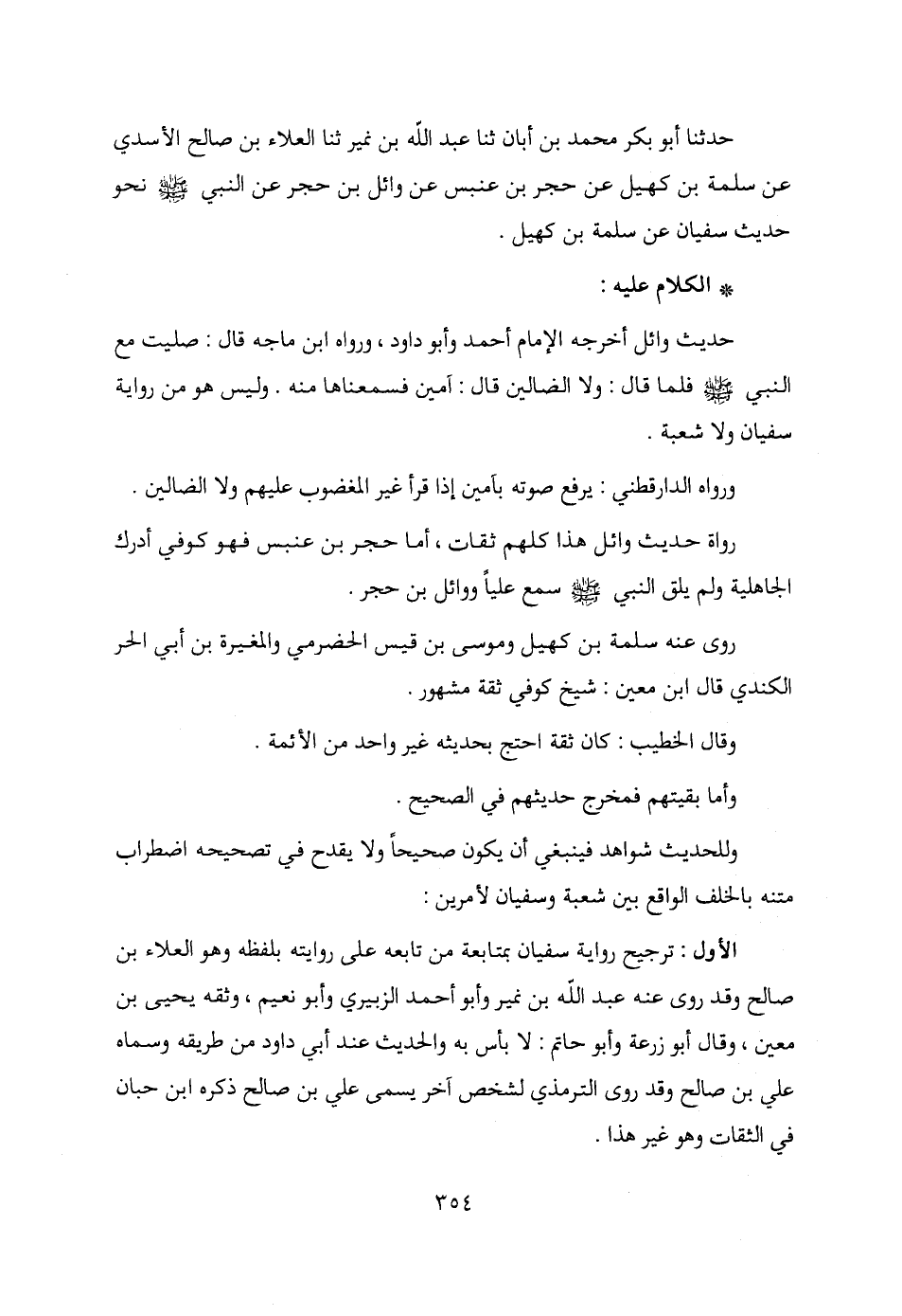 حدثنا أبو بكر محمد بن أبان ثنا عبد الله بن نمير ثنا العلاء بن صالح الأسدي عن سلمة بن كهيل عن حجر بن عنبس عن وائل بن حجر عن النبي - صلى الله عليه وسلم - نحو حديث سفيان عن سلمة بن كهيل.