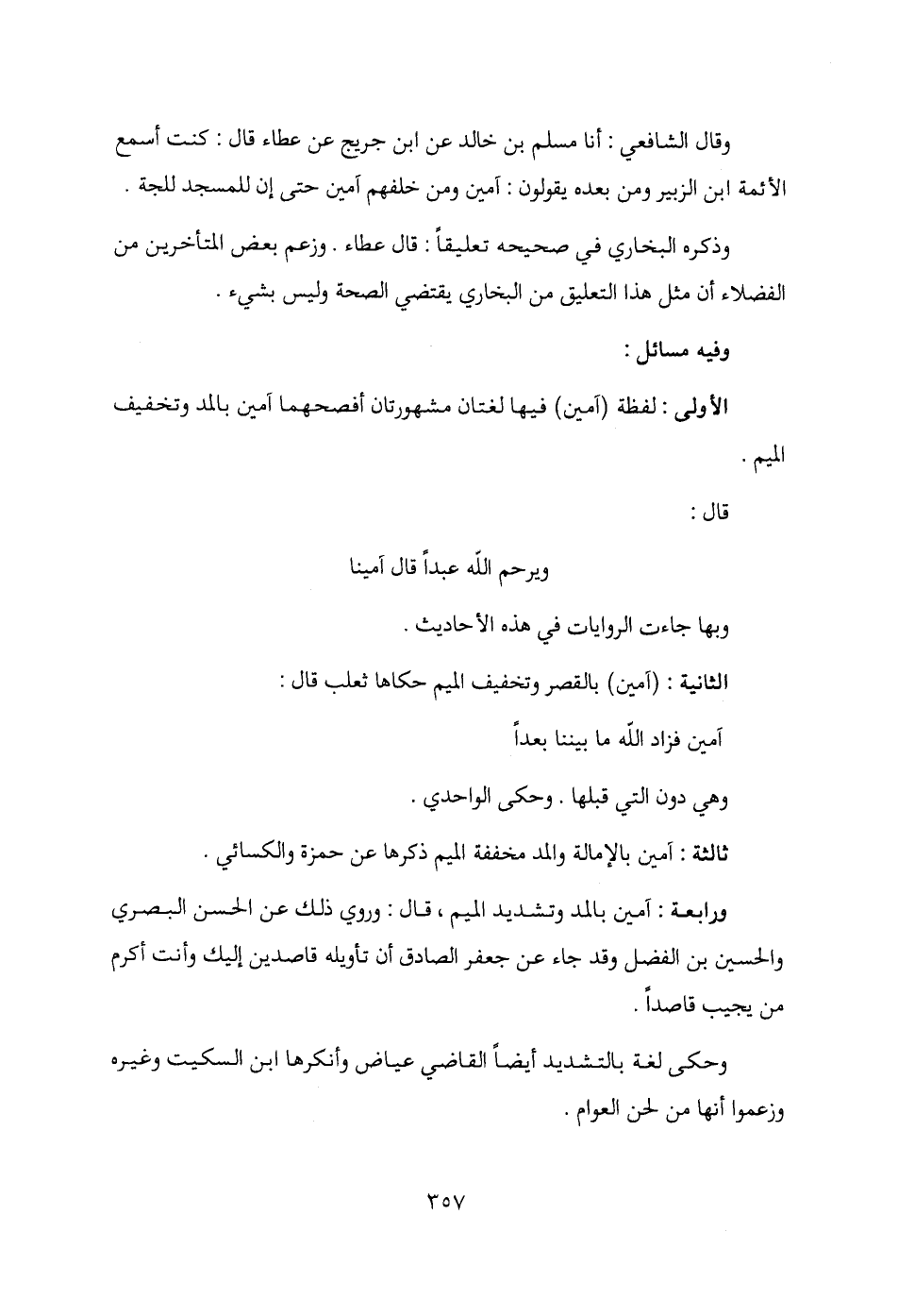 الأولى: لفظة (آمين) فيها لغتان مشهورتان أفصحهما آمين بالمد وتخفيف الميم.