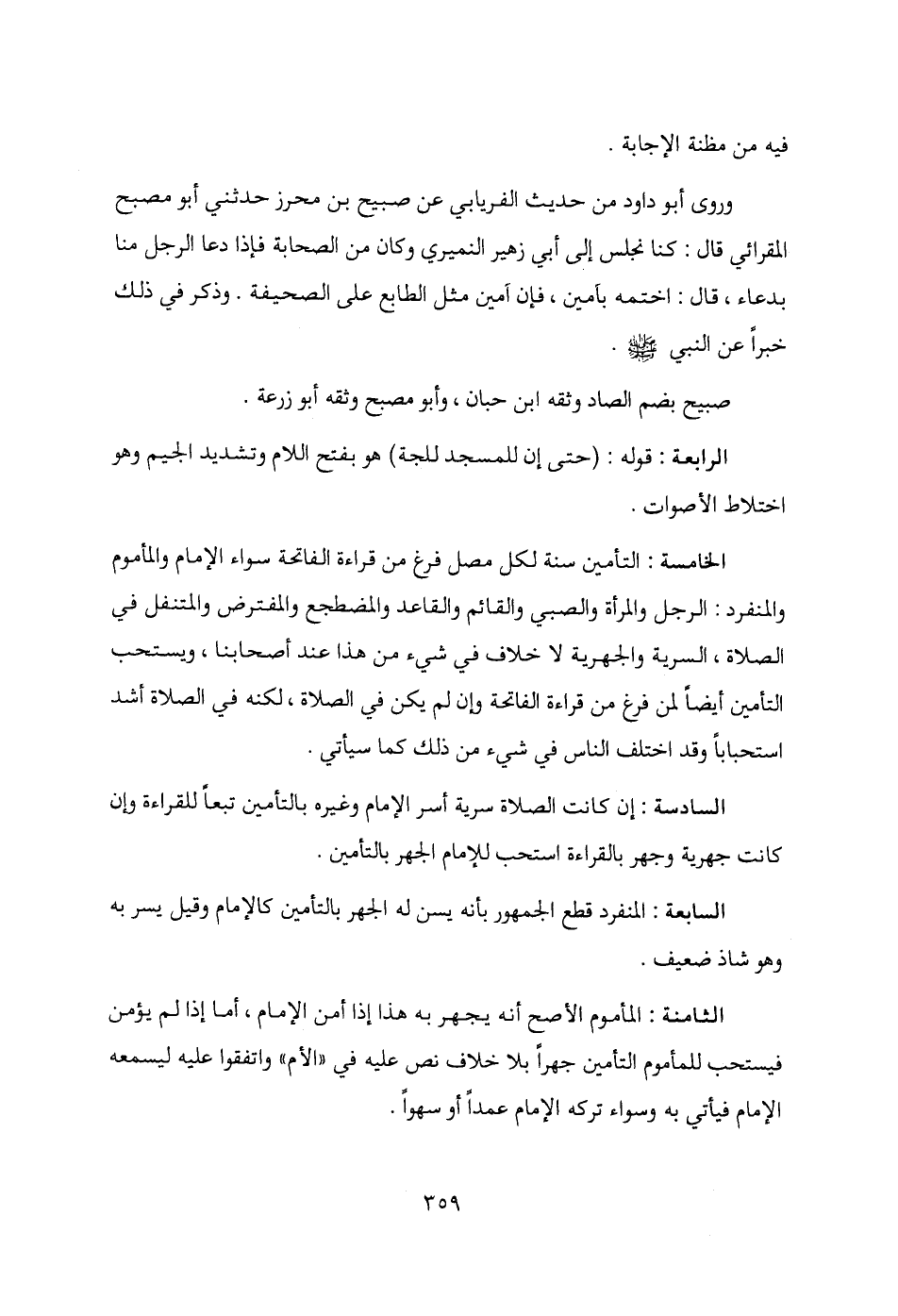 الخامسة: التأمين سنة لكل مصل فرغ من قراءة الفاتحة سواء الإمام والمأموم والمنفرد: الرجل والمرأة والصبي والقائم والقاعد والمضطجع والمفترض والمتنفل في الصلاة، السرية والجهرية لا خلاف في شيء من هذا عند أصحابنا، ويستحب التأمين أيضًا لمن فرغ من قراءة الفاتحة وإن لم يكن في الصلاة، لكنه في الصلاة أشد استحبابًا وقد اختلف الناس في شيء من ذلك كما سيأتي.