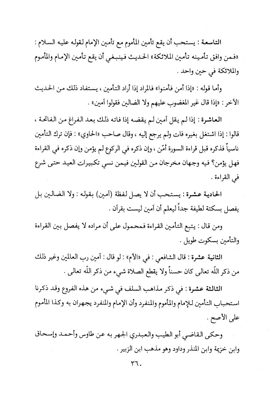 التاسعة: يستحب أن يقع تأمين المأموم مع تأمين الإمام لقوله - عليه السلام -: "فمن وافق تأمينه تأمين الملائكة" الحديث فينبغي أن يقع تأمين الإمام والمأموم والملائكة في حين واحد.