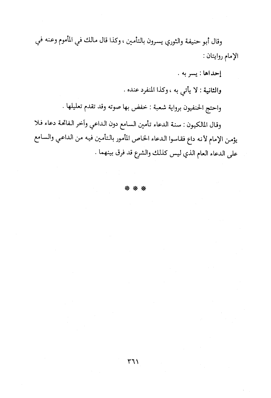 وقال المالكيون: سنة الدعاء تأمين السامع دون الداعي وآخر الفاتحة دعاء فلا يؤمن الإمام لأنه داع فقاسوا الدعاء الخاص المأمور بالتأمين فيه من الداعي والسامع على الدعاء العام الذي ليس كذلك والشرع قد فرق بينهما.