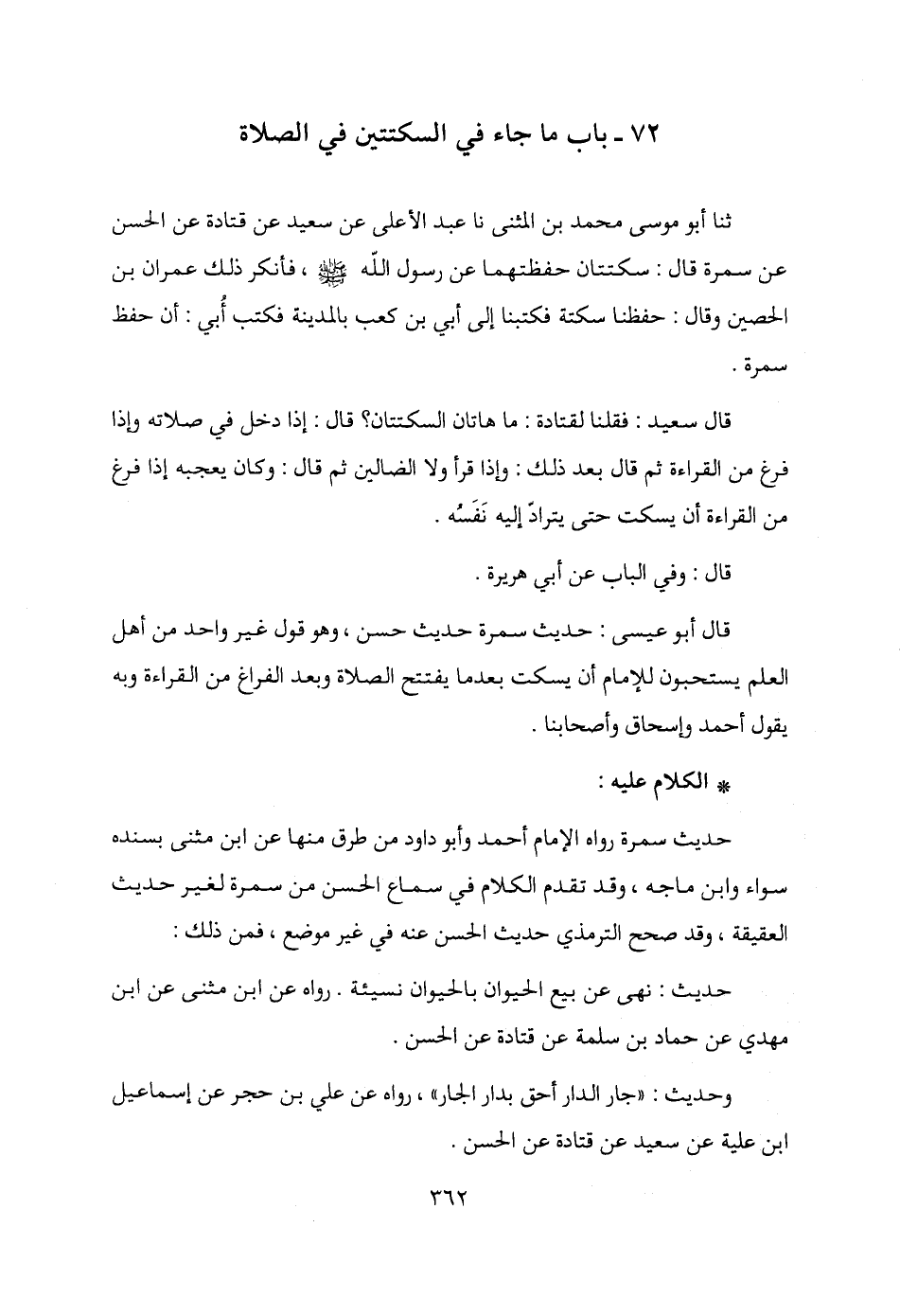 قال أبو عيسى: حديث سمرة حديث حسن، وهو قول غير واحد من أهل العلم يستحبون للإمام أن يسكت بعدما يفتتح الصلاة وبعد الفراغ من القراءة وبه يقول أحمد وإسحاق وأصحابنا.