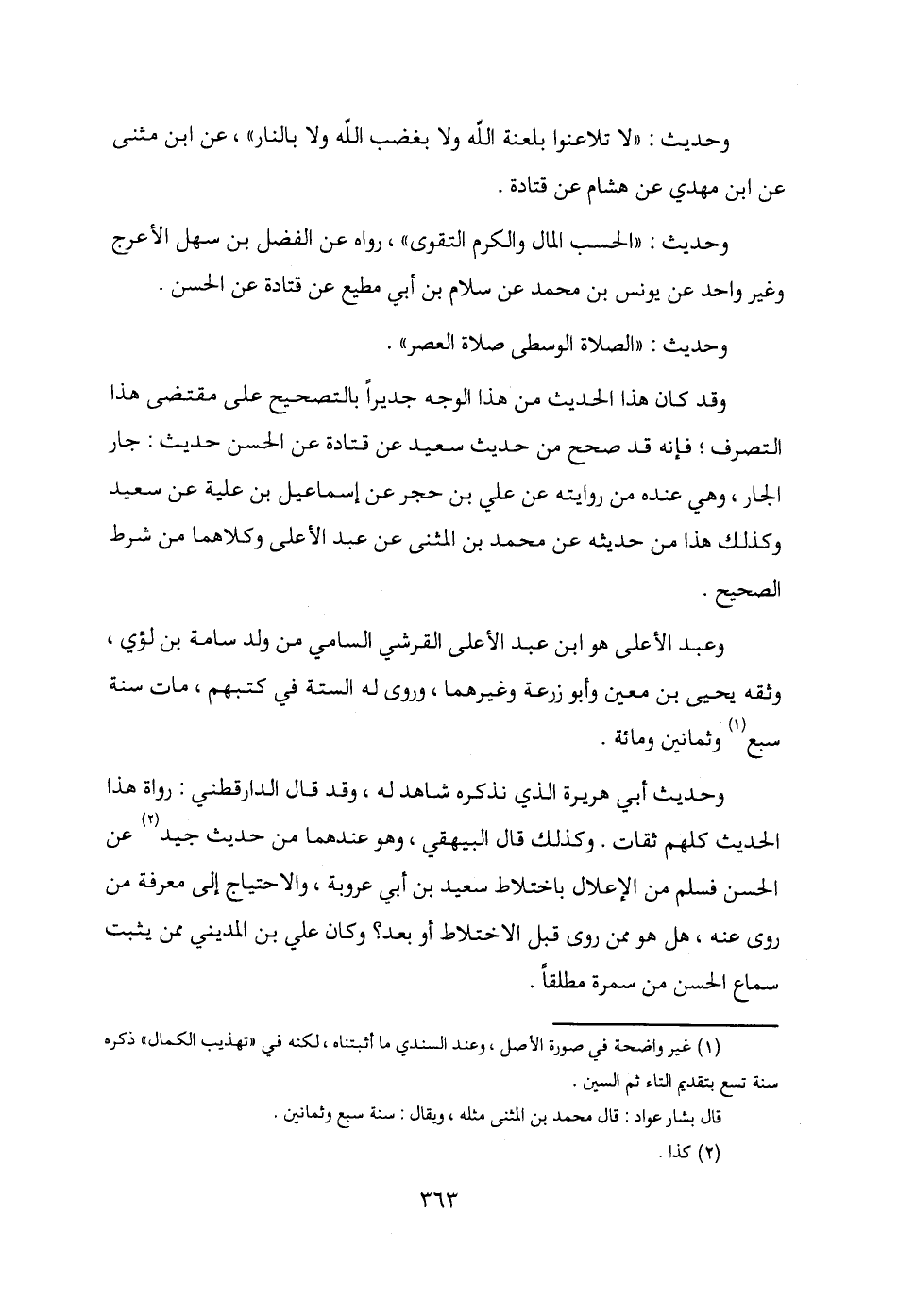 وقد كان هذا الحديث من هذا الوجه جديرًا بالتصحيح على مقتضى هذا التصرف؛ فإنه قد صحح من حديث سعيد عن قتادة عن الحسن حديث: جار الجار، وهي عنده من روايته عن علي بن حجر عن إسماعيل بن علية عن سعيد وكذلك هذا من حديثه عن محمد بن المثنى عن عبد الأعلى وكلاهما من شرط الصحيح.