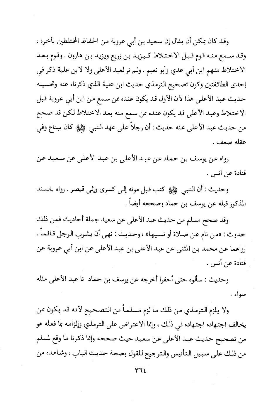 وقد كان يمكن أن يقال إن سعيد بن أبي عروبة من الحفاظ المختلطين بأخرة، وقد سمع منه قوم قبل الاختلاط كيزيد بن زريع ويزيد بن هارون. وقوم بعد الاختلاط منهم ابن أبي عدي وأبو نعيم. ولم نر لعبد الأعلى ولا لابن علية ذكر في إحدى الطائفتين وكون تصحيح الترمذي حديث ابن علية الذي ذكرناه عنه وتحسينه حديث عبد الأعلى هذا لأن الأول قد يكون عنده ممن سمع من ابن أبي عروبة قبل الاختلاط وعبد الأعلى قد يكون عنده ممن سمع منه بعد الاختلاط لكن قد صحح من حديث عبد الأعلى عنه حديث: أن رجلًا على عهد النبي - صلى الله عليه وسلم - كان يبتاع وفي عقله ضعف.