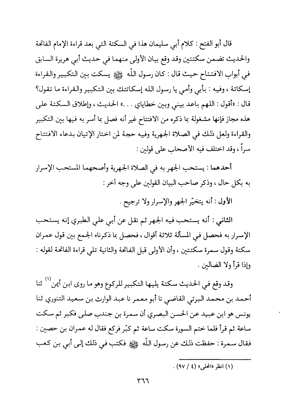 الثاني: أنه يستحب فيه الجهر ثم نقل عن أبي علي الطبري إنه يستحب الإسرار به فحصل في المسألة ثلاثة أقوال، فحصل بما ذكرناه الجمع بين قول عمران سكتة وقول سمرة سكتتين، وأن الأولى قبل الفاتحة والثانية تلي قراءة الفاتحة لقوله: وإذا قرأ ولا الضالين.