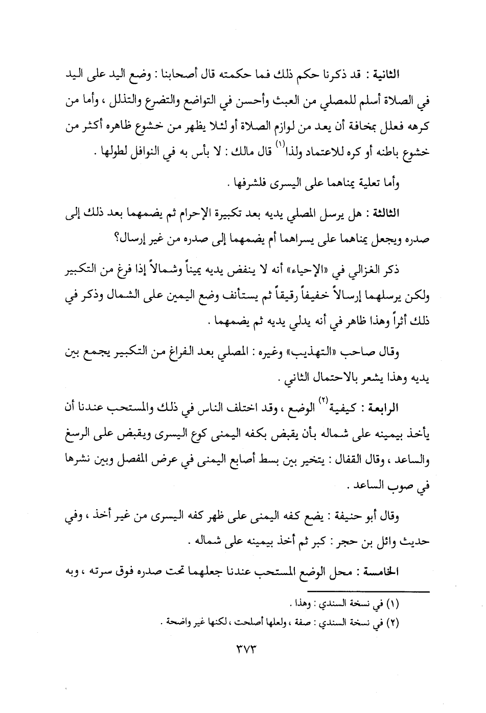 الثانية: قد ذكرنا حكم ذلك فما حكمته قال أصحابنا: وضع اليد على اليد في الصلاة أسلم للمصلي من العبث وأحسن في التواضع والتضرع والتذلل، وأما من كرهه فعلل بمخافة أن يعد من لوازم الصلاة أو لئلا يظهر من خشوع ظاهره أكثر من خشوع باطنه أو كره للاعتماد ولذا (¬1) قال مالك: لا بأس به في النوافل لطولها.