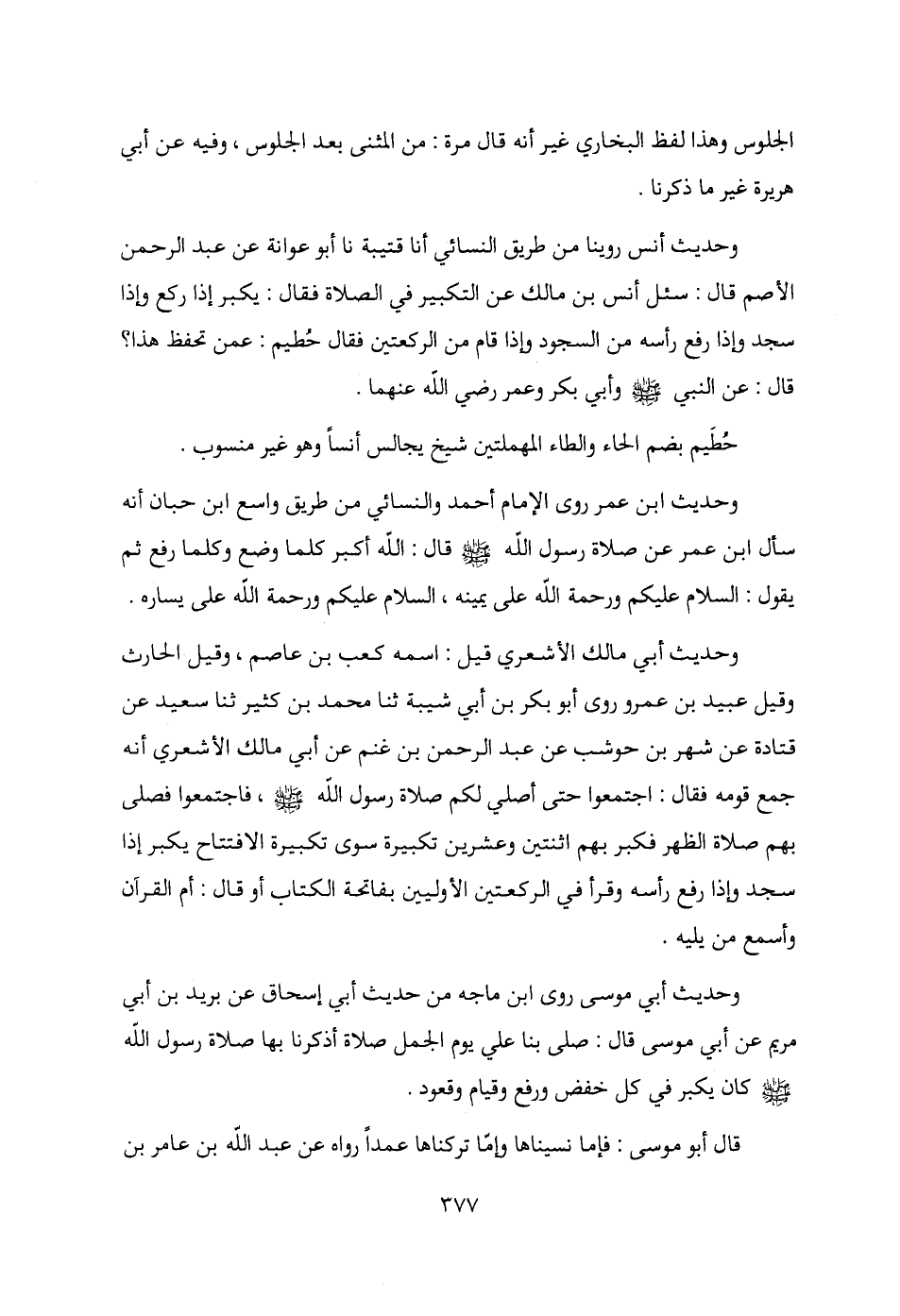 وحديث أنس روينا من طريق النسائي أنا قتيبة نا أبو عوانة عن عبد الرحمن الأصم قال: سئل أنس بن مالك عن التكبير في الصلاة فقال: يكبر إذا ركع وإذا سجد وإذا رفع رأسه من السجود وإذا قام من الركعتين فقال حُطيم: عمن تحفظ هذا؟ قال: عن النبي - صلى الله عليه وسلم - وأبي بكر وعمر رضي الله عنهما.