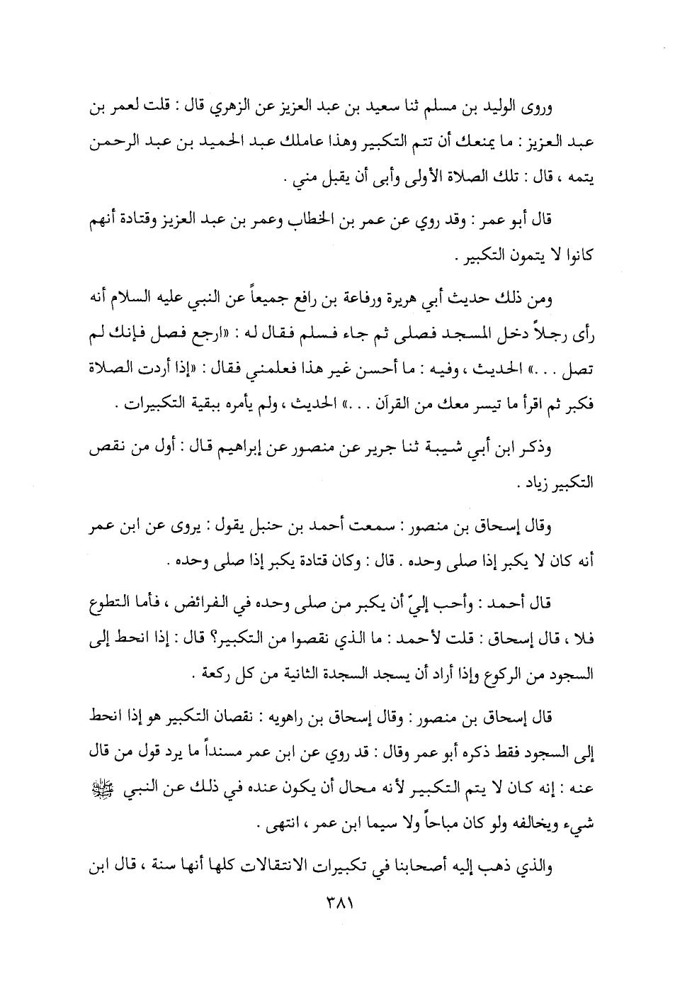 قال إسحاق بن منصور: وقال إسحاق بن راهويه: نقصان التكبير هو إذا انحط إلى السجود فقط ذكره أبو عمر وقال: قد روي عن ابن عمر مسندًا ما يرد قول من قال عنه: إنه كان لا يتم التكبير لأنه محال أن يكون عنده في ذلك عن النبي - صلى الله عليه وسلم - شيء ويخالفه ولو كان مباحًا ولا سيما ابن عمر، انتهى.