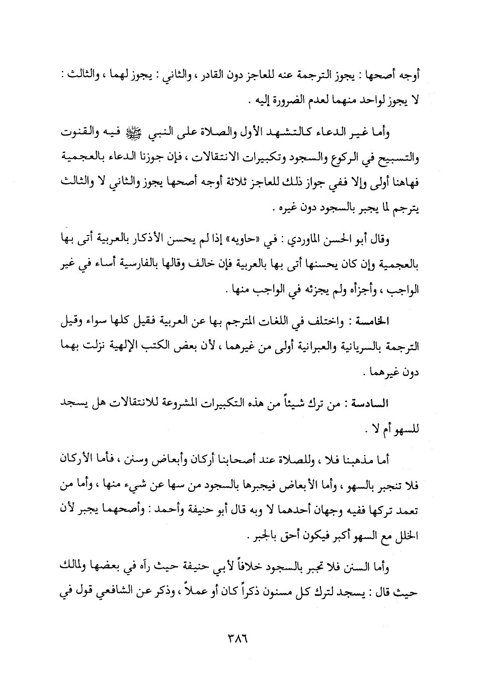 وأما غير الدعاء كالتشهد الأول والصلاة على النبي - صلى الله عليه وسلم - فيه والقنوت والتسبيح في الركوع والسجود وتكبيرات الانتقالات، فإن جوزنا الدعاء بالعجمية فهاهنا أولى وإلا ففي جواز ذلك للعاجز ثلاثة أوجه أصحها يجوز والثاني لا والثالث يترجم لما يجبر بالسجود دون غيره.