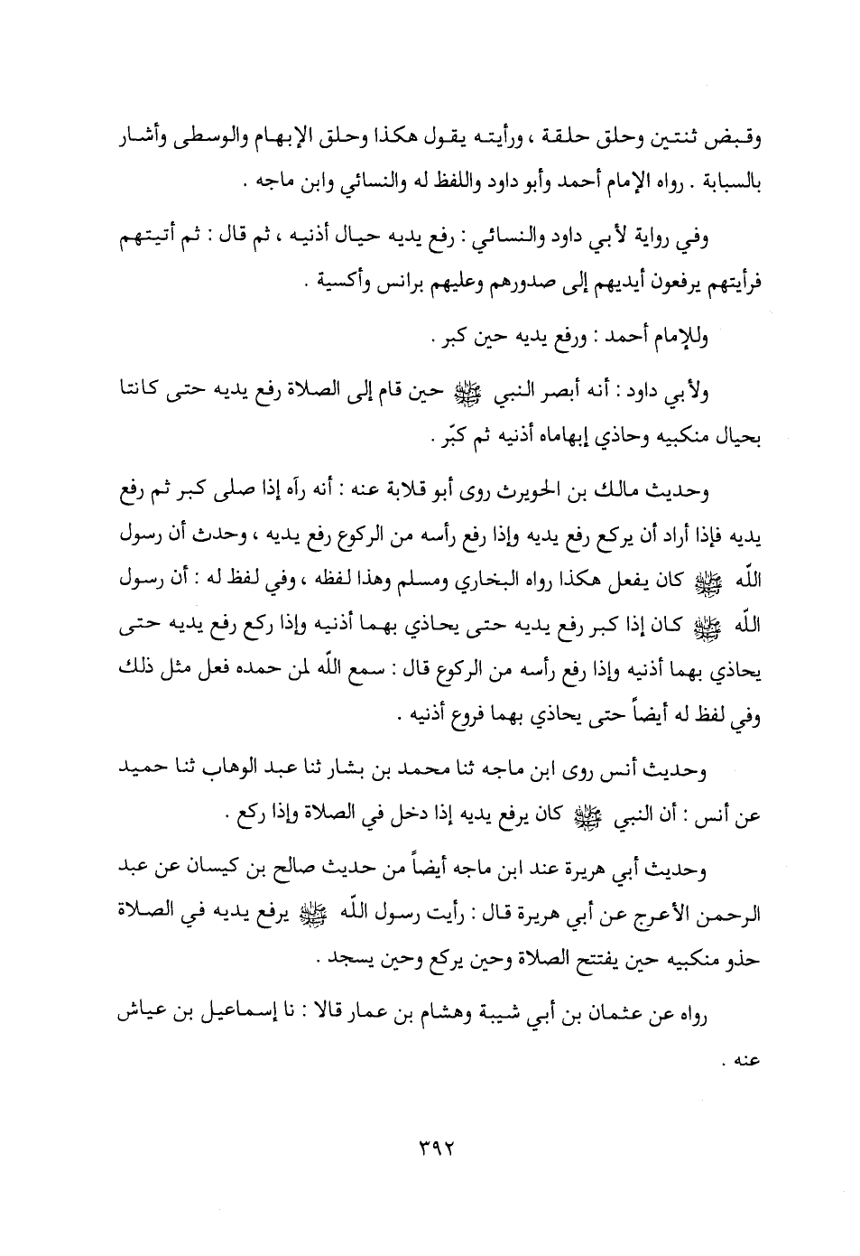 وحديث مالك بن الحويرث روى أبو قلابة عنه: أنه رآه إذا صلى كبر ثم رفع يديه فإذا أراد أن يركع رفع يديه وإذا رفع رأسه من الركوع رفع يديه، وحدث أن رسول الله - صلى الله عليه وسلم - كان يفعل هكذا رواه البخاري ومسلم وهذا لفظه، وفي لفظ له: أن رسول الله - صلى الله عليه وسلم - كان إذا كبر رفع يديه حتى يحاذي بهما أذنيه وإذا ركع رفع يديه حتى يحاذي بهما أذنيه وإذا رفع رأسه من الركوع قال: سمع الله لمن حمده فعل مثل ذلك وفي لفظ له أيضًا حتى يحاذي بهما فروع أذنيه.