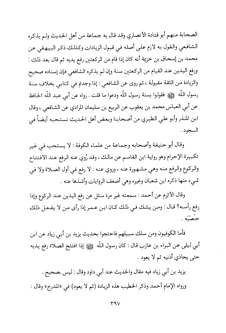 الصحابة منهم أبو قتادة الأنصاري وقد قال به جماعة من أهل الحديث ولم يذكره الشافعي والقول به لازم على أصله في قبول الزيادات وكذلك ذكر البيهقي عن محمد بن إسحاق بن خزيمة أنه كان إذا قام من الركعتين رفع يديه ثم قال بعد ذلك: ورفع اليدين عند القيام من الركعتين سنة وإن لم يذكره الشافعي فإن إسناده صحيح والزيادة من الثقة مقبولة، ثم روى عن الشافعي: إذا وجدتم في كتابي بخلاف سنة رسول الله - صلى الله عليه وسلم - فقولوا بسنة رسول الله ودعوا ما قلت. رواه عن أبي عبد الله الحافظ عن أبي العباس محمد بن يعقوب عن الربيع بن سليمان الرادي عن الشافعي، وقال ابن المنذر وأبو علي البري من أصحابنا وبعض أهل الحديث نستحبه أيضًا في السجود.
