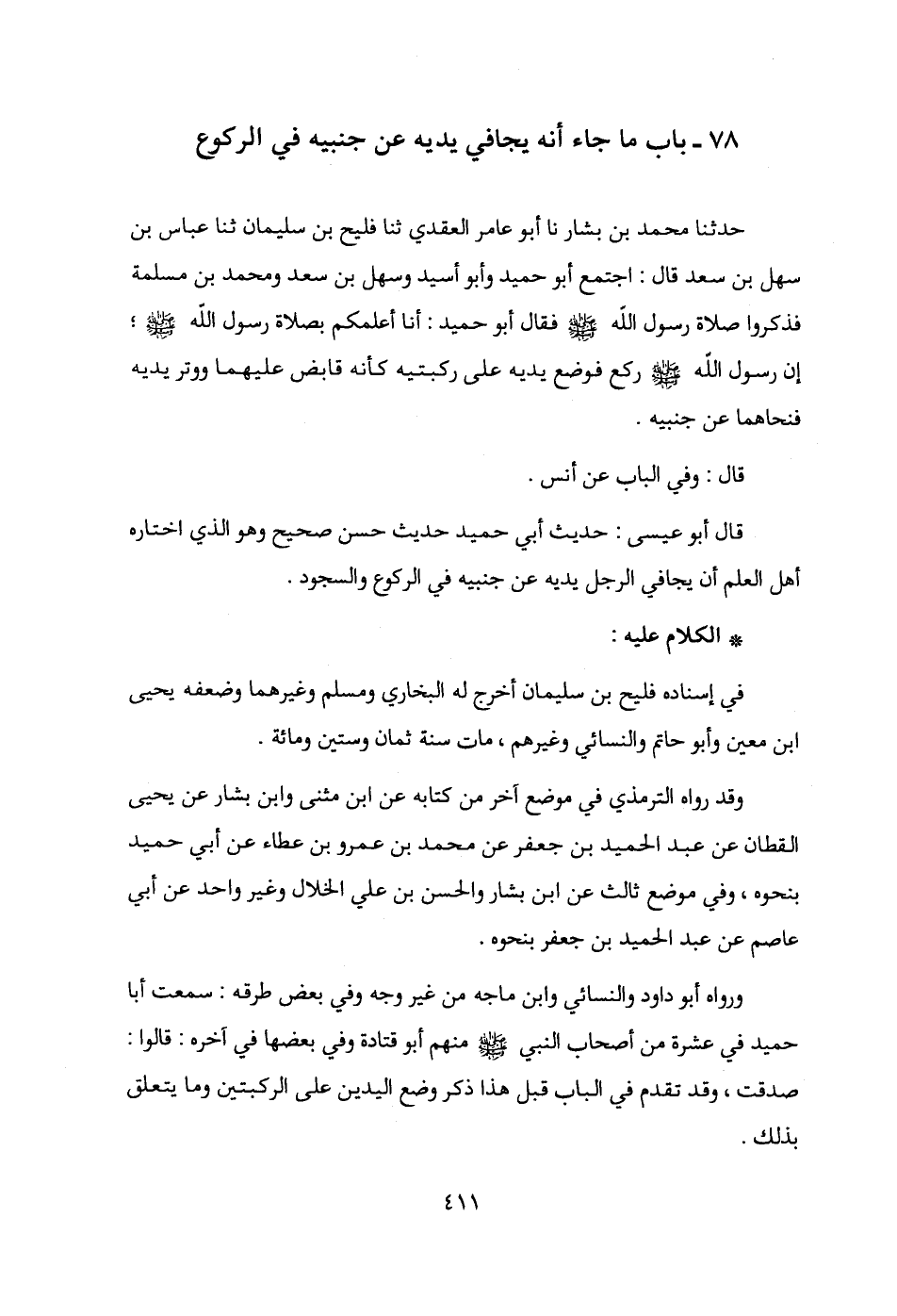 قال أبو عيسى: حديث أبي حميد حديث حسن صحيح وهو الذي اختاره أهل العلم أن يجافي الرجل يديه عن جنبيه في الركوع والسجود.