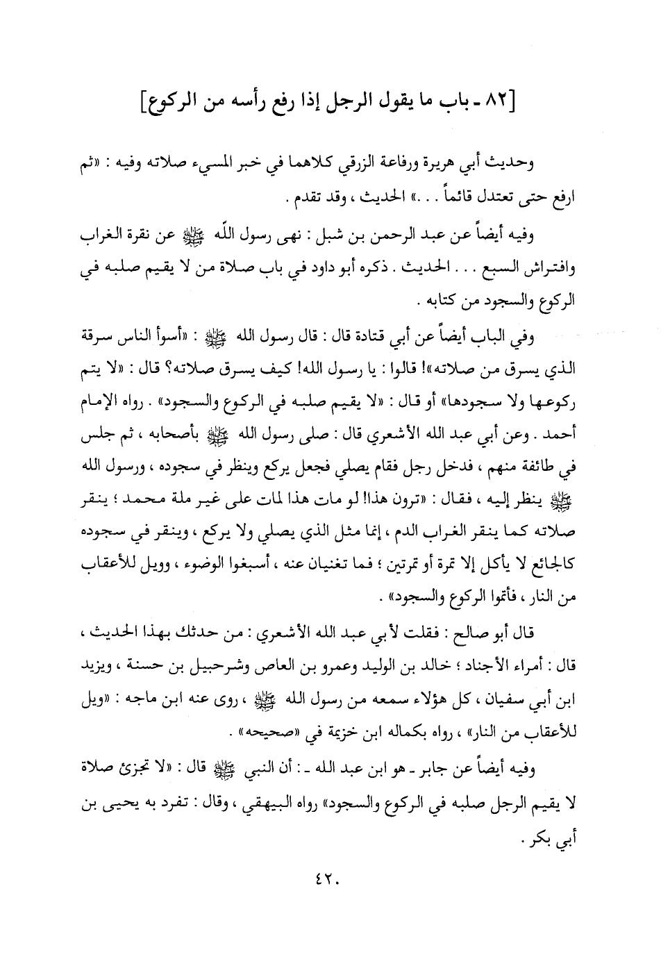 وفي الباب أيضًا عن أبي قتادة قال: قال رسول الله - صلى الله عليه وسلم -: "أسوأ الناس سرقة الذي يسرق من صلاته"! قالوا: يا رسول الله! كيف يسرق صلاته؟ قال: "لا يتم ركوعها ولا سجودها" أو قال: "لا يقيم صلبه في الركوع والسجود". رواه الإمام أحمد. وعن أبي عبد الله الأشعري قال: صلى رسول الله - صلى الله عليه وسلم - بأصحابه، ثم جلس في طائفة منهم، فدخل رجل فقام يصلي فجعل يركع وينظر في سجوده، ورسول الله - صلى الله عليه وسلم - ينظر إليه، فقال: "ترون هذا! لو مات هذا لمات على غير ملة محمد؛ ينقر صلاته كما ينقر الغراب الدم، إنما مثل الذي يصلي ولا يركع، وينقر في سجوده كالجائع لا يأكل إلا تمرة أو تمرتين؛ فما تغنيان عنه، أسبغوا الوضوء، وويل للأعقاب من النار، فأتموا الركوع والسجود".