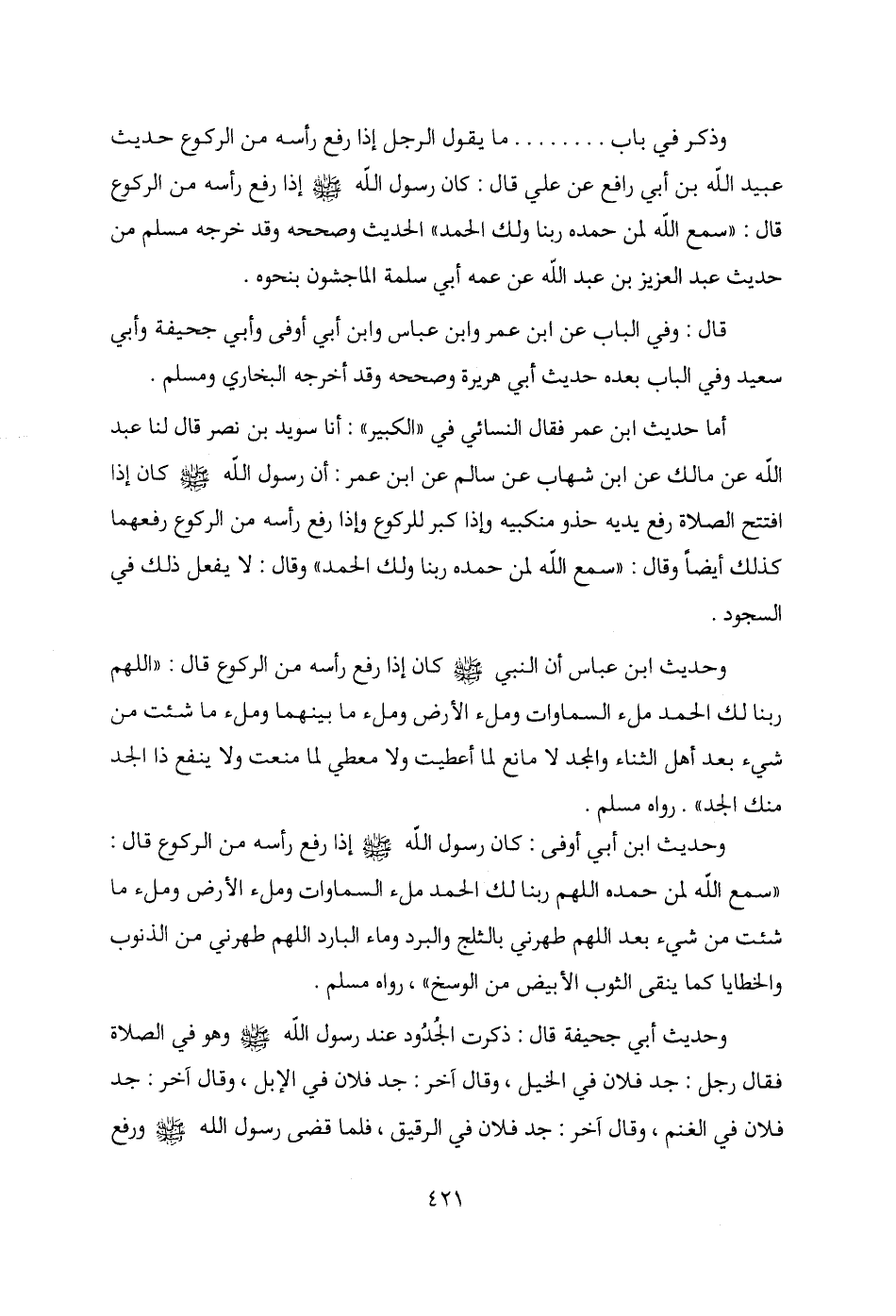 وحديث ابن عباس أن النبي - صلى الله عليه وسلم - كان إذا رفع رأسه من الركوع قال: "اللهم ربنا لك الحمد ملء السماوات وملء الأرض وملء ما بينهما وملء ما شئت من شيء بعد أهل الثناء والجد لا مانع لما أعطيت ولا معطي لا منعت ولا ينفع ذا الجد منك الجد". رواه مسلم.