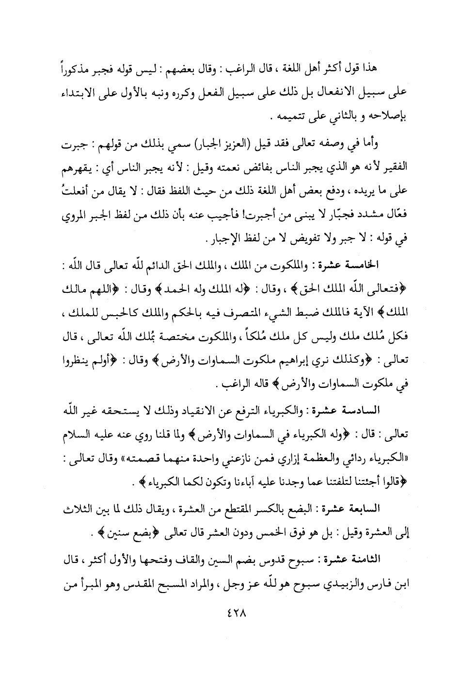 الخامسة عشرة: والملكوت من الملك، والملك الحق الدائم لله تعالى قال الله: {فتعالى الله الملك الحق}، وقال: {له الملك وله الحمد} وقال: {اللهم مالك الملك} الآية فالملك ضبط الشيء المتصرف فيه بالحكم والملك كالحبس للملك، فكل مُلك ملك وليس كل ملك مُلكًا، والملكوت مختصة بمُلك الله تعالى، قال تعالى: {وكذلك نري إبراهيم ملكوت السماوات والأرض} وقال: {أولم ينظروا في ملكوت السماوات والأرض} قاله الراغب.