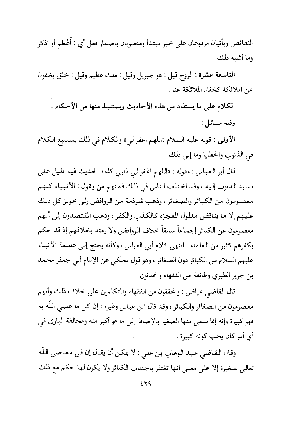 قال أبو العباس: وقوله: "اللهم اغفر لي ذنبي كله" الحديث فيه دليل على نسبة الذنوب إليه، وقد اختلف الناس في ذلك فمنهم من يقول: الأنبياء كلهم معصومون من الكبائر والصغائر، وذهب شرذمة من الروافض إلى تجويز كل ذلك عليهم إلا ما يناقض مدلول المعجزة كالكذب والكفر، وذهب المقتصدون إلى أنهم معصومون عن الكبائر إجماعًا سابقًا خلاف الروافض ولا يعتد بخلافهم إذ قد حكم بكفرهم كثير من العلماء. انتهى كلام أبي العباس، وكأنه يحتج إلى عصمة الأنبياء عليهم السلام من الكبائر دون الصغائر، وهو قول محكي عن الإمام أبي جعفر محمد بن جرير الطبري وطائفة من الفقهاء والمحدثين.