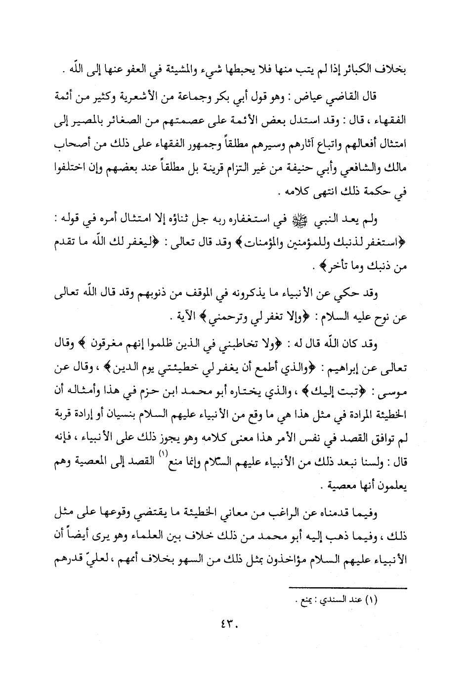 قال القاضي عياض: وهو قول أبي بكر وجماعة من الأشعرية وكثير من أئمة الفقهاء، قال: وقد استدل بعض الأئمة على عصمتهم من الصغائر بالمصير إلى امتثال أفعالهم واتباع آثارهم وسيرهم مطلقًا وجمهور الفقهاء على ذلك من أصحاب مالك والشافعي وأبي حنيفة من غير التزام قرينة بل مطلقًا عند بعضهم وإن اختلفوا في حكمة ذلك انتهى كلامه.