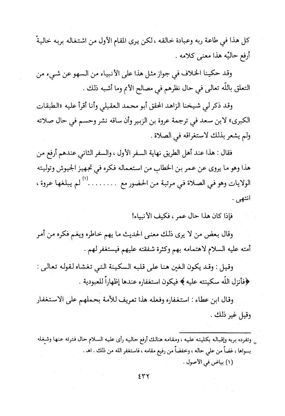 = وتفرده بربه وإقباله بكليته عليه، ومقامه هنالك أرفع حاليه رأى - عليه السلام - حال فترته عنها وشغله بسواها، غضًّا من علي حاله، وخفضًا من رفيع مقامه، فاستغفر الله من ذلك. اهـ.