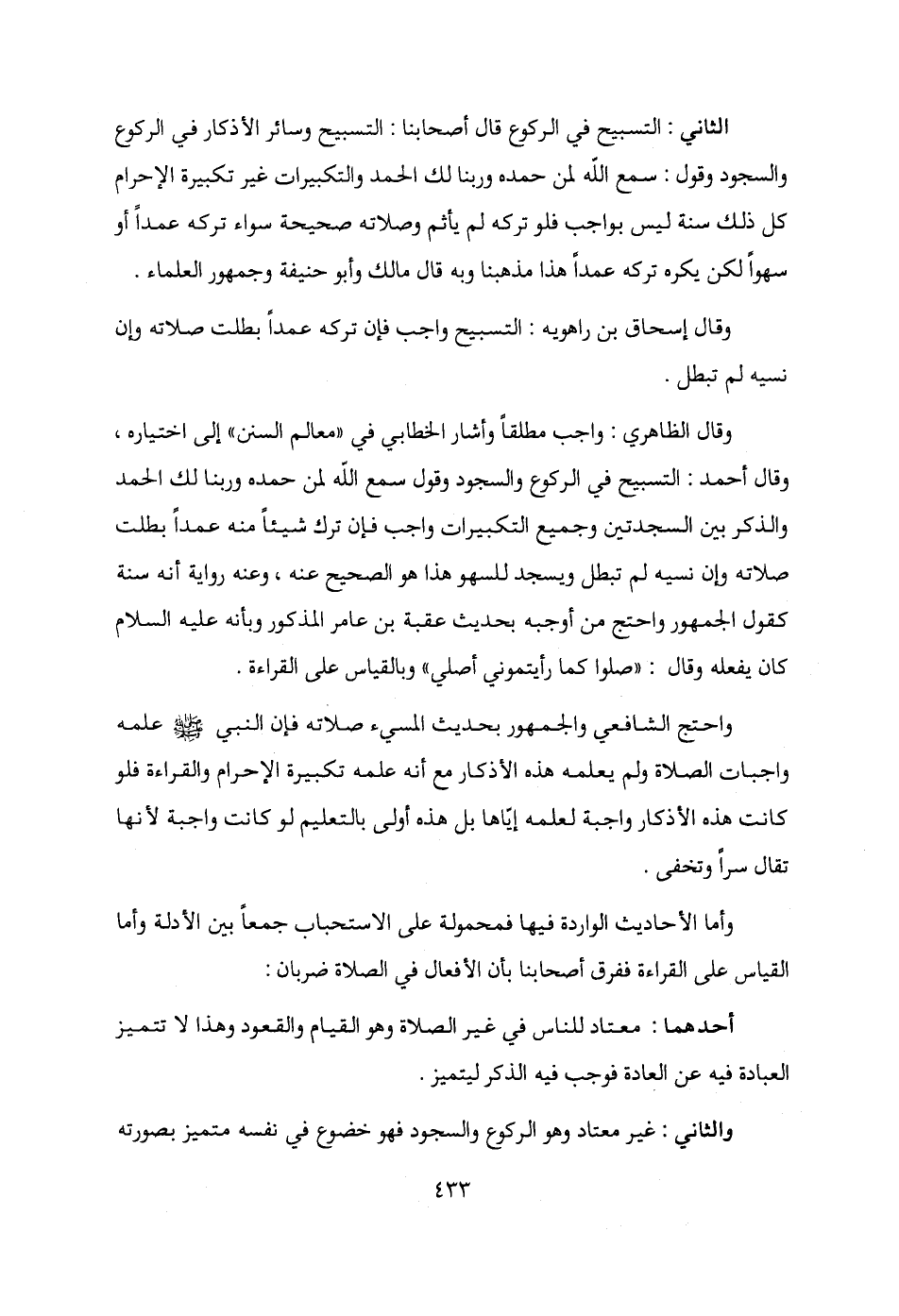 الثاني: التسبيح في الركوع قال أصحابنا: التسبيح وسائر الأذكار في الركوع والسجود وقول: سمع الله لمن حمده وربنا لك الحمد والتكبيرات غير تكبيرة الإحرام كل ذلك سنة ليس بواجب فلو تركه لم يأثم وصلاته صحيحة سواء تركه عمدًا أو سهوًا لكن يكره تركه عمدًا هذا مذهبنا وبه قال مالك وأبو حنيفة وجمهور العلماء.