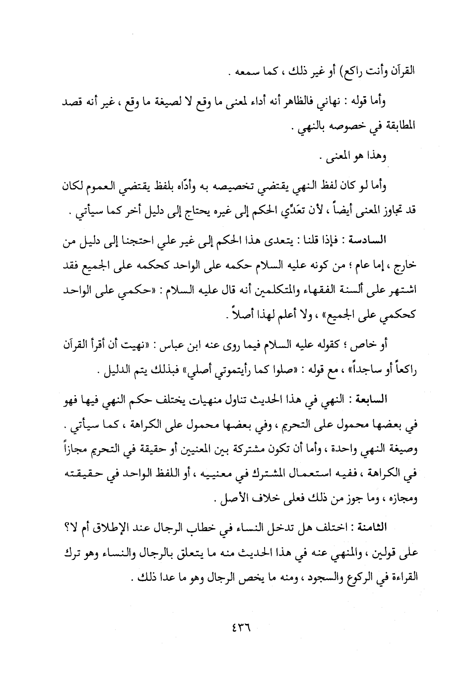 أو خاص؛ كقوله - عليه السلام - فيما روى عنه ابن عباس: "نهيت أن أقرأ القرآن راكعًا أو ساجدًا"، مع قوله: "صلوا كما رأيتموتي أصلي" فبذلك يتم الدليل.