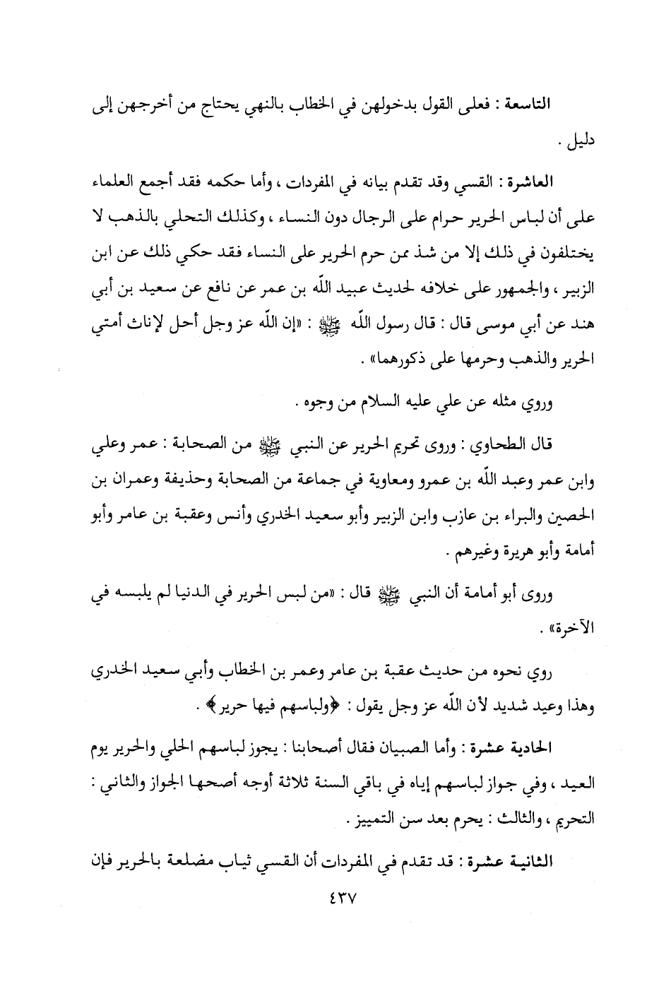 العاشرة: القسي وقد تقدم بيانه في المفردات، وأما حكمه فقد أجمع العلماء على أن لباس الحرير حرام على الرجال دون النساء، وكذلك التحلي بالذهب لا يختلفون في ذلك إلا من شذ ممن حرم الحرير على النساء فقد حكي ذلك عن ابن الزبير، والجمهور على خلافه لحديث عبيد الله بن عمر عن نافع عن سعيد بن أبي هند عن أبي موسى قال: قال رسول الله - صلى الله عليه وسلم -: "إن الله عزَّ وجلَّ أحل لإناث أمتي الحرير والذهب وحرمها على ذكورهما".