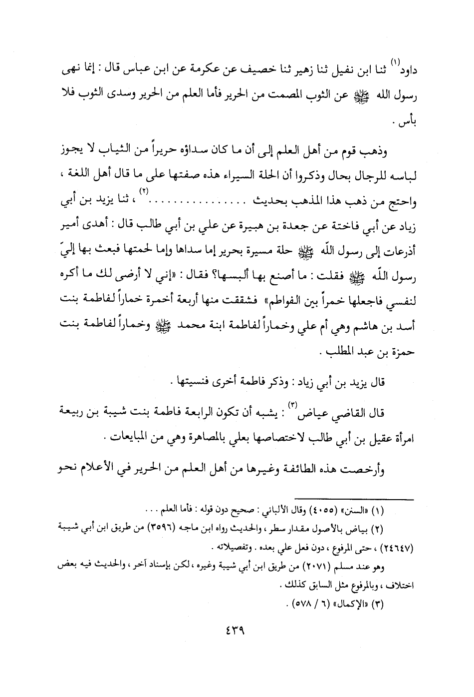 وذهب قوم من أهل العلم إلى أن ما كان سداؤه حريرًا من الثياب لا يجوز لباسه للرجال بحال وذكروا أن الحلة السيراء هذه صفتها على ما قال أهل اللغة، واحتج من ذهب هذا المذهب بحديث ............... (¬2)، ثنا يزيد بن أبي زياد عن أبي فاختة عن جعدة بن هبيرة عن علي بن أبي طالب قال: أهدى أمير أذرعات إلى رسول الله - صلى الله عليه وسلم - حلة مسيرة بحرير إما سداها وإما لحمتها فبعث بها إليّ رسول الله - صلى الله عليه وسلم - فقلت: ما أصنع بها ألبسها؟ فقال: "إني لا أرضى لك ما أكره لنفسي فاجعلها خمرًا بين الفواطم" فشققت منها أربعة أخمرة خمارًا لفاطمة بنت أسد بن هاشم وهي أم علي وخمارًا لفاطمة ابنة محمد - صلى الله عليه وسلم - وخمارًا لفاطمة بنت حمزة بن عبد المطلب.