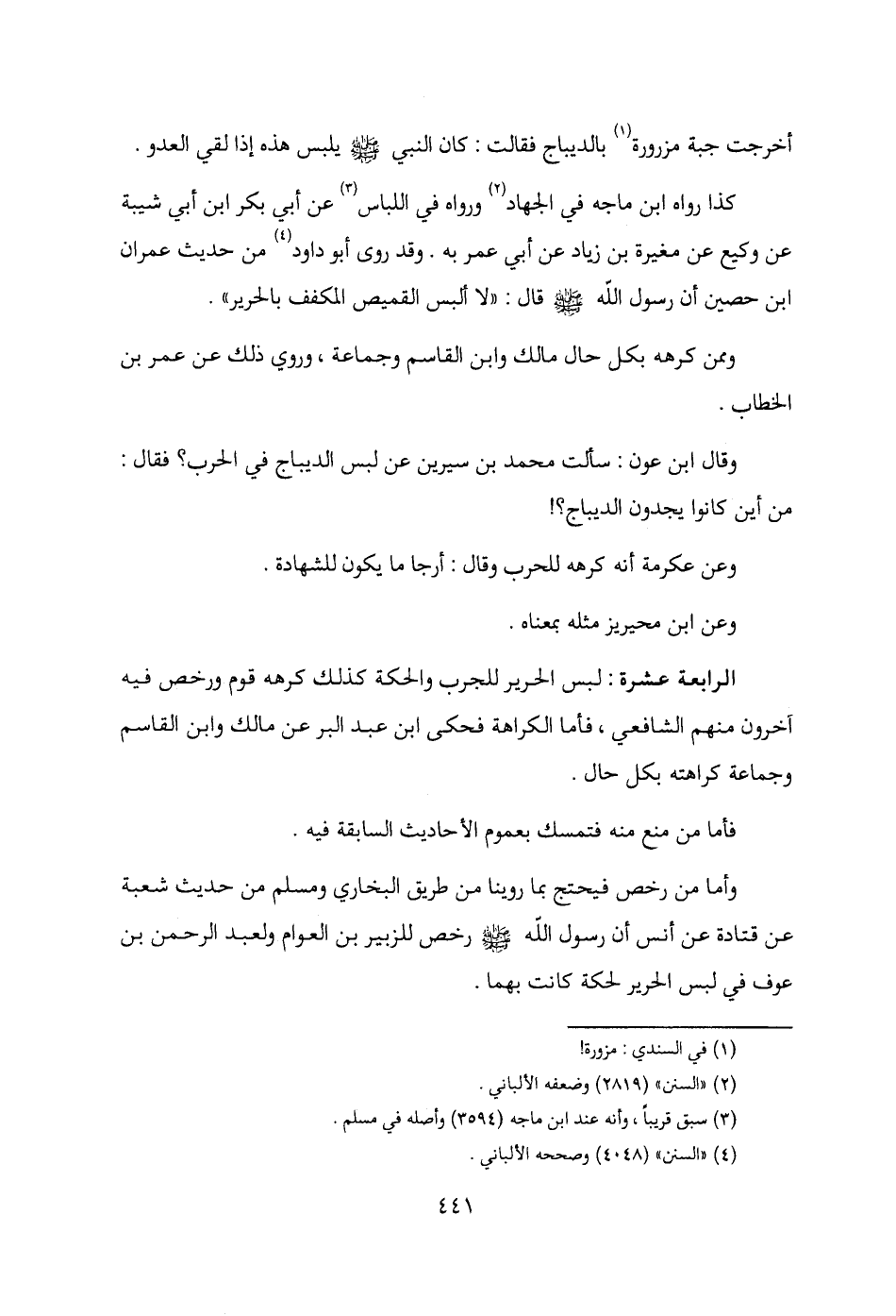 الرابعة عشرة: لبس الحرير للجرب والحكة كذلك كرهه قوم ورخص فيه آخرون منهم الشافعي، فأما الكراهة فحكى ابن عبد البر عن مالك وابن القاسم وجماعة كراهته بكل حال.