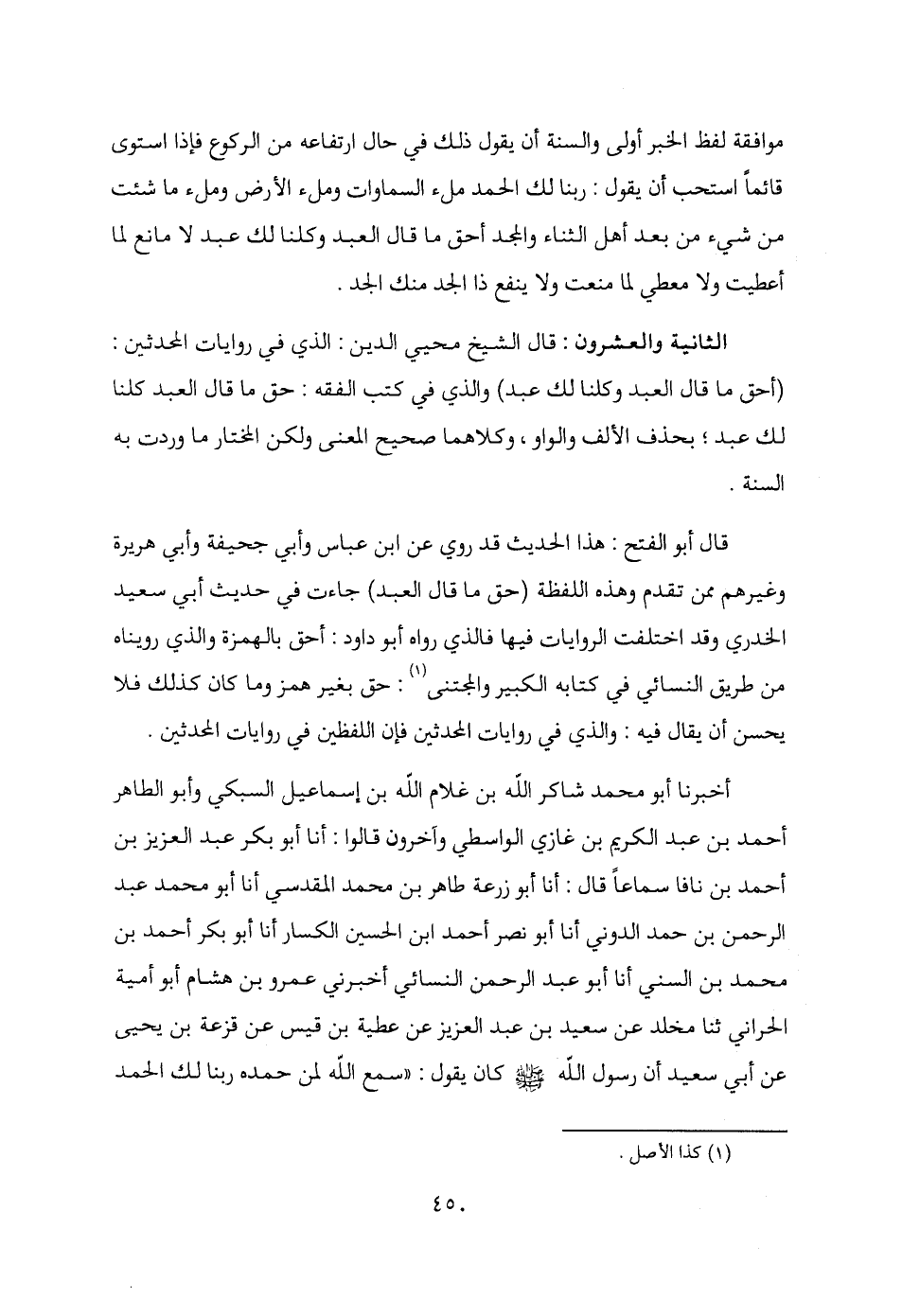 الثانية والعشرون: قال الشيخ محيي الدين: الذي في روايات المحدثين: (أحق ما قال العبد وكلنا لك عبد) والذي في كتب الفقه: حق ما قال العبد كلنا لك عبد؛ بحذف الألف والواو، وكلاهما صحيح المعنى ولكن المختار ما وردت به السنة.