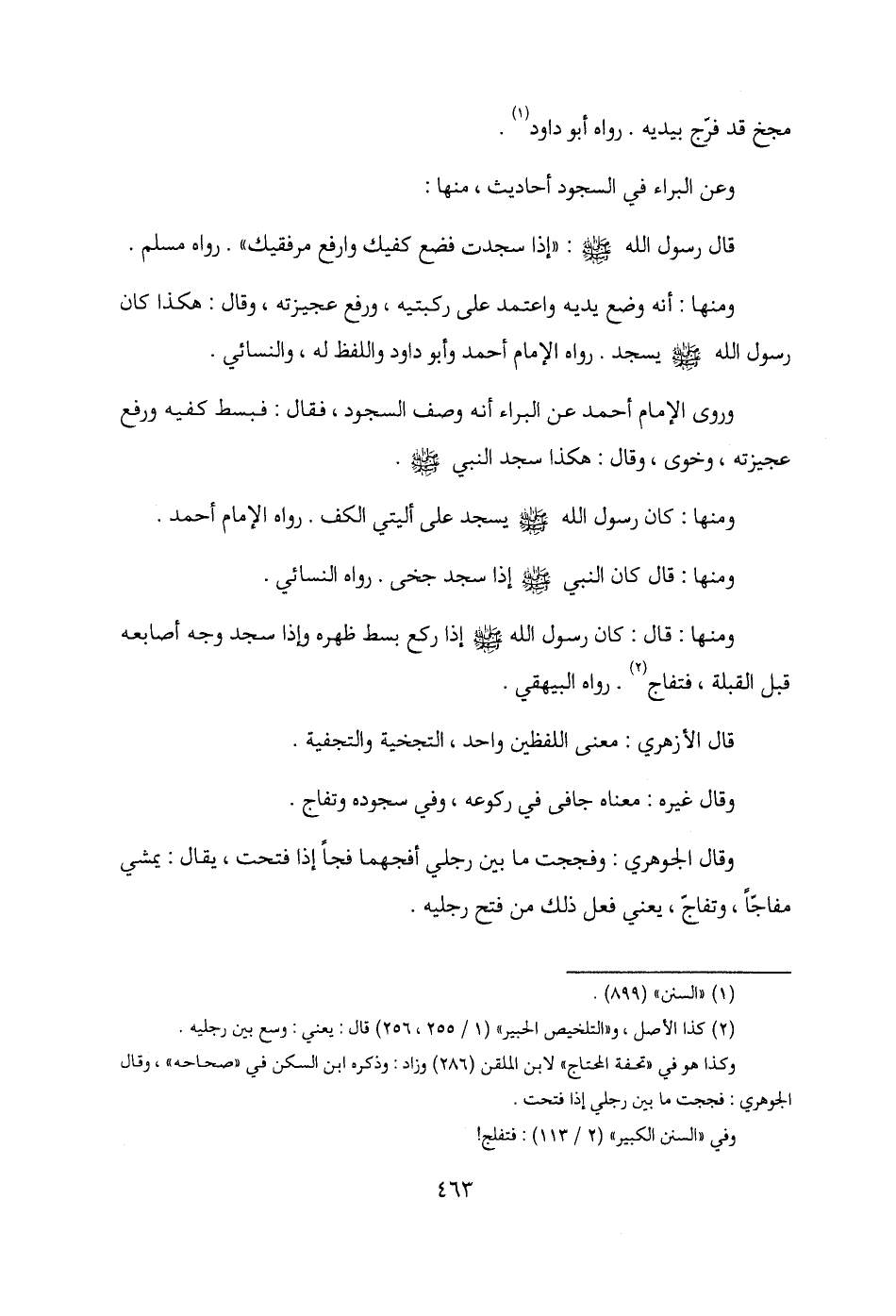 وروى الإمام أحمد عن البراء أنه وصف السجود، فقال: فبسط كفيه ورفع عجيزته، وخوى، وقال: هكذا سجد النبي - صلى الله عليه وسلم -.