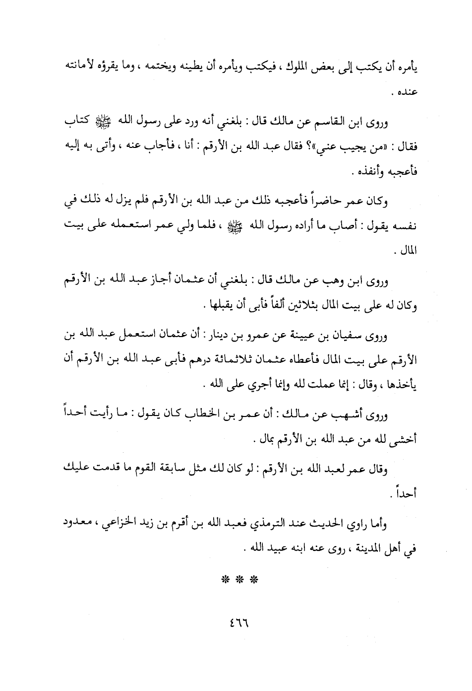 وروى أشهب عن مالك: أن عمر بن الخطاب كان يقول: ما رأيت أحدًا أخشى لله من عبد الله بن الأرقم بمال.