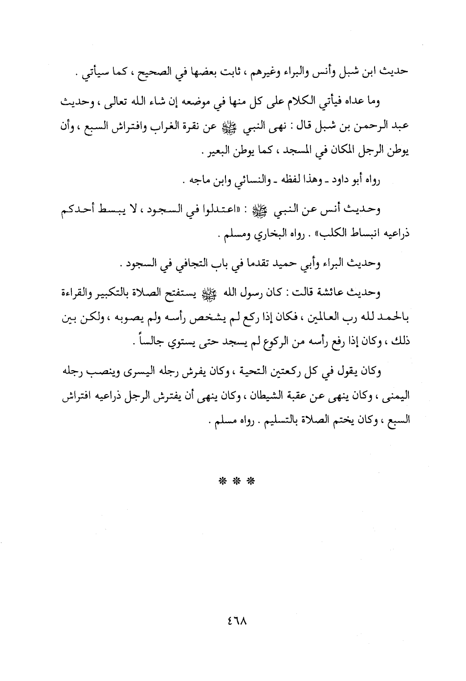 وما عداه فيأتي الكلام على كل منها في موضعه إن شاء الله تعالى، وحديث عبد الرحمن بن شبل قال: نهى النبي - صلى الله عليه وسلم - عن نقرة الغراب وافتراش السبع، وأن يوطن الرجل المكان في المسجد، كما يوطن البعير.