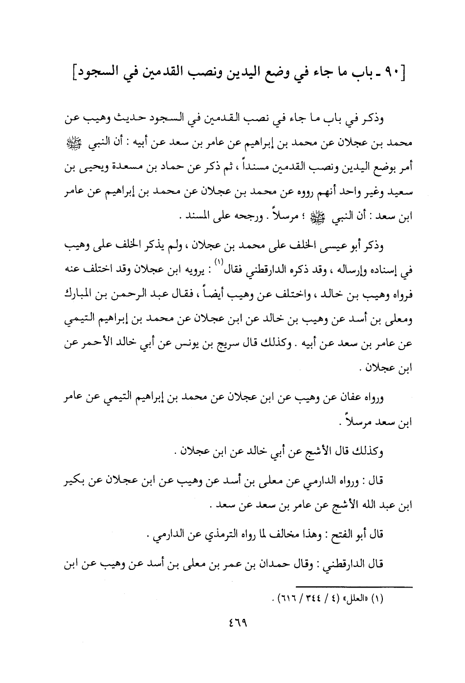 وذكر في باب ما جاء في نصب القدمين في السجود حديث وهيب عن محمد بن عجلان عن محمد بن إبراهيم عن عامر بن سعد عن أبيه: أن النبي - صلى الله عليه وسلم - أمر بوضع اليدين ونصب القدمين مسندًا، ثم ذكر عن حماد بن مسعدة ويحيى بن سعيد وغير واحد أنهم رووه عن محمد بن عجلان عن محمد بن إبراهيم عن عامر بن سعد: أن النبي - صلى الله عليه وسلم -؛ مرسلًا. ورجحه على المسند.