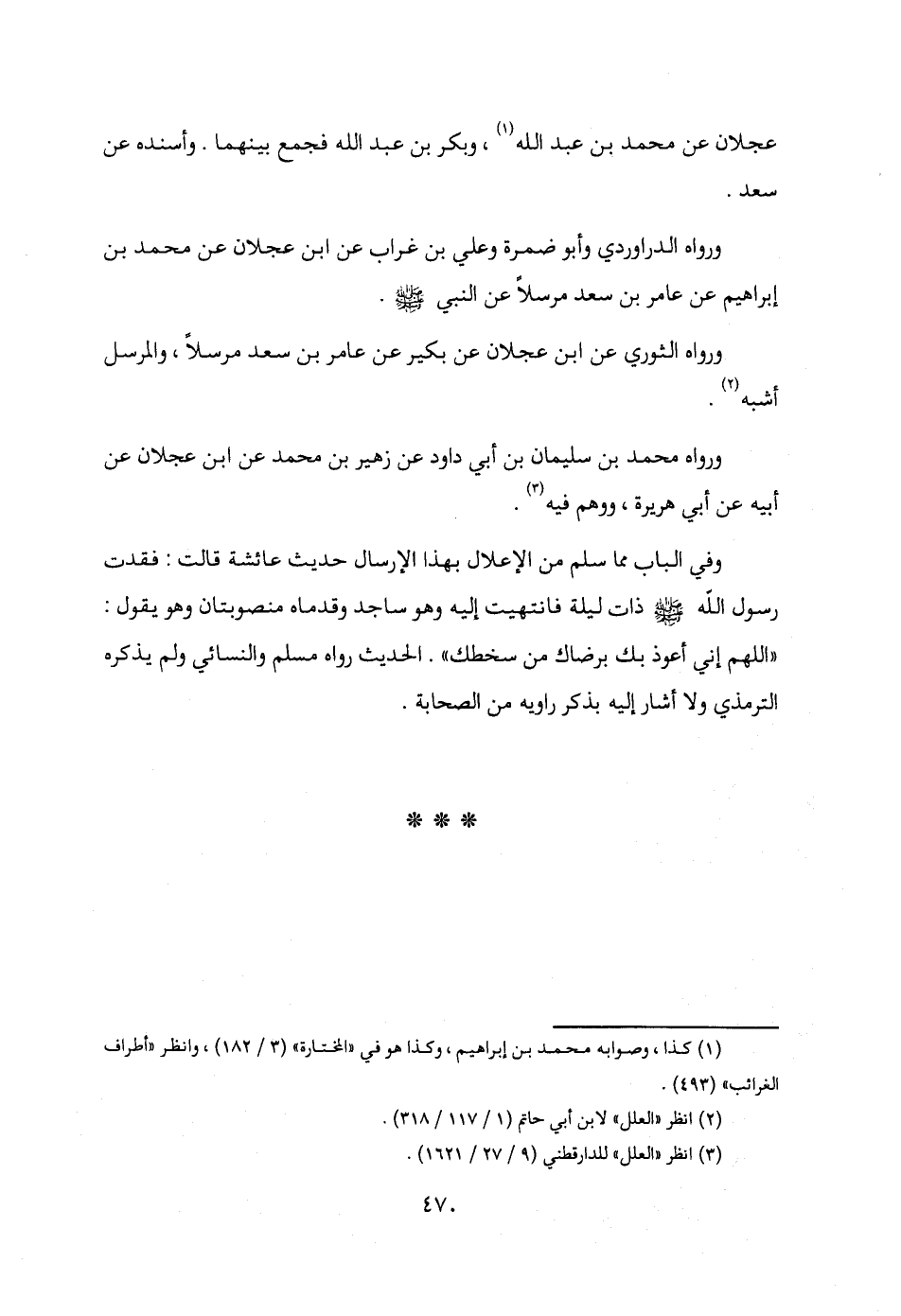 وفي الباب مما سلم من الإعلال بهذا الإرسال حديث عائشة قالت: فقدت رسول الله - صلى الله عليه وسلم - ذات ليلة فانتهيت إليه وهو ساجد وقدماه منصوبتان وهو يقول: "اللهم إني أعوذ بك برضاك من سخطك". الحديث رواه مسلم والنسائي ولم يذكره الترمذي ولا أشار إليه بذكر راويه من الصحابة.