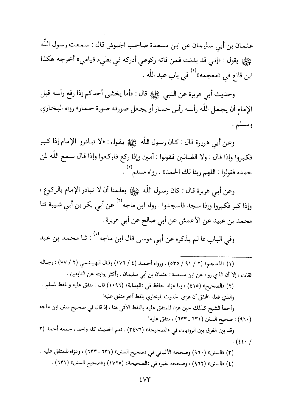 وعن أبي هريرة قال: كان رسول الله - صلى الله عليه وسلم - يعلمنا أن لا نبادر الإمام بالركوع، وإذا كبر فكبروا وإذا سجد فاسجدوا. رواه ابن ماجه (¬3) عن أبي بكر بن أبي شيبة ثنا محمد بن عبيد عن الأعمش عن أبي صالح عن أبي هريرة.