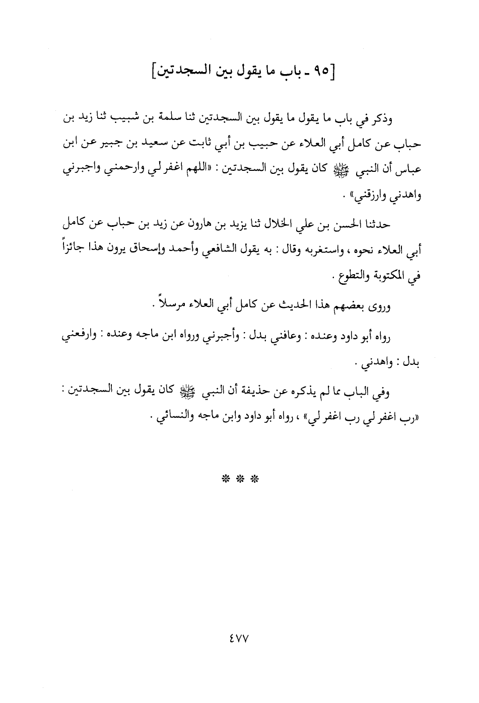 وذكر في باب ما يقول ما يقول بين السجدتين ثنا سلمة بن شبيب ثنا زيد بن حباب عن كامل أبي العلاء عن حبيب بن أبي ثابت عن سعيد بن جبير عن ابن عباس أن النبي - صلى الله عليه وسلم - كان يقول بين السجدتين: "اللهم اغفر لي وارحمني واجبرني واهدني وارزقني".