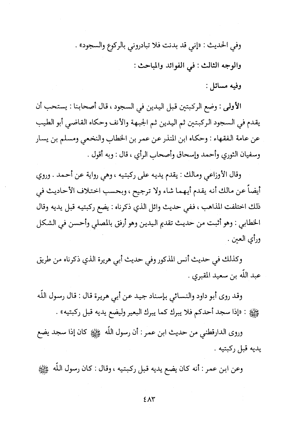 وقد روى أبو داود والنسائي بإسناد جيد عن أبي هريرة قال: قال رسول الله - صلى الله عليه وسلم -: "إذا سجد أحدكم فلا يبرك كما يبرك البعير وليضع يديه قبل ركبتيه".