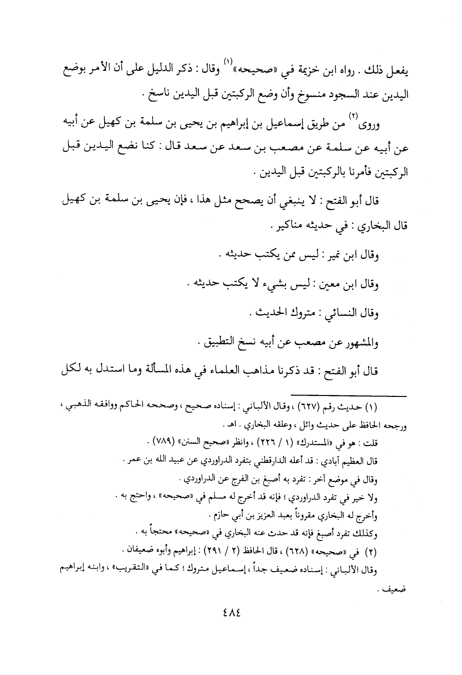 وروى (¬2) من طريق إسماعيل بن إبراهيم بن يحيى بن سلمة بن كهيل عن أبيه عن أبيه عن سلمة عن مصعب بن سعد عن سعد قال. كنا نضع اليدين قبل الركبتين فأمرنا بالركبتين قبل اليدين.