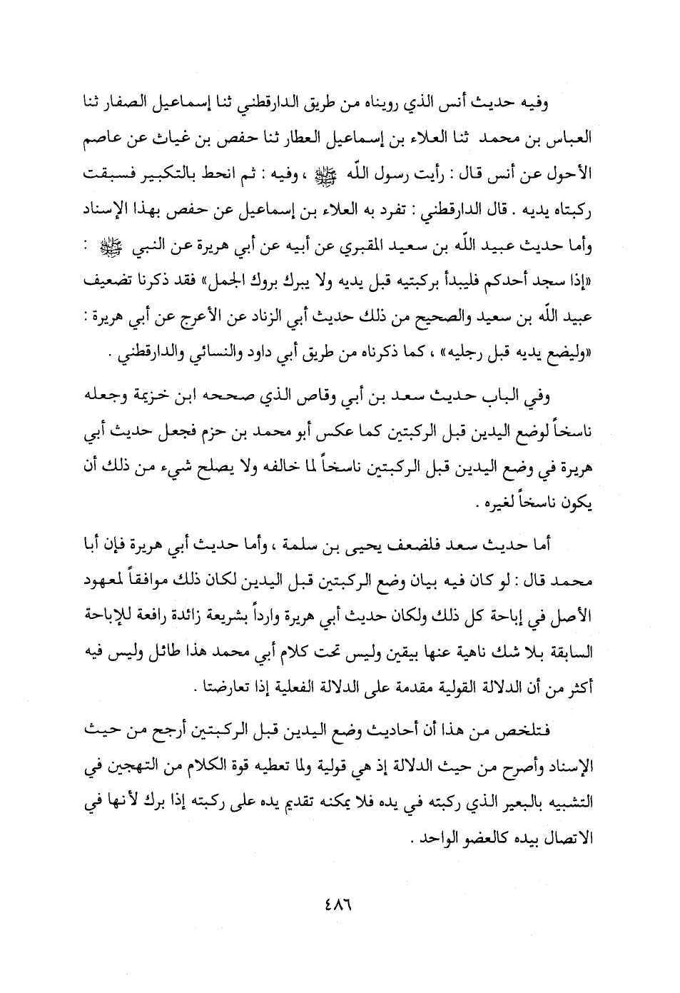 وفيه حديث أنس الذي رويناه من طريق الدارقطني ثنا إسماعيل الصفار ثنا العباس بن محمد ثنا العلاء بن إسماعيل العطار ثنا حفص بن غياث عن عاصم الأحول عن أنس قال: رأيت رسول الله - صلى الله عليه وسلم -، وفيه: ثم انحط بالتكبير فسبقت ركبتاه يديه. قال الدارقطني: تفرد به العلاء بن إسماعيل عن حفص بهذا الإسناد وأما حديث عبيد الله بن سعيد المقبري عن أبيه عن أبي هريرة عن النبي - صلى الله عليه وسلم -: "إذا سجد أحدكم فليبدأ بركبتيه قبل يديه ولا يبرك بروك الجمل" فقد ذكرنا تضعيف عبيد الله بن سعيد والصحيح من ذلك حديث أبي الزناد عن الأعرج عن أبي هريرة: "وليضع يديه قبل رجليه"، كما ذكرناه من طريق أبي داود والنسائي والدارقطني.