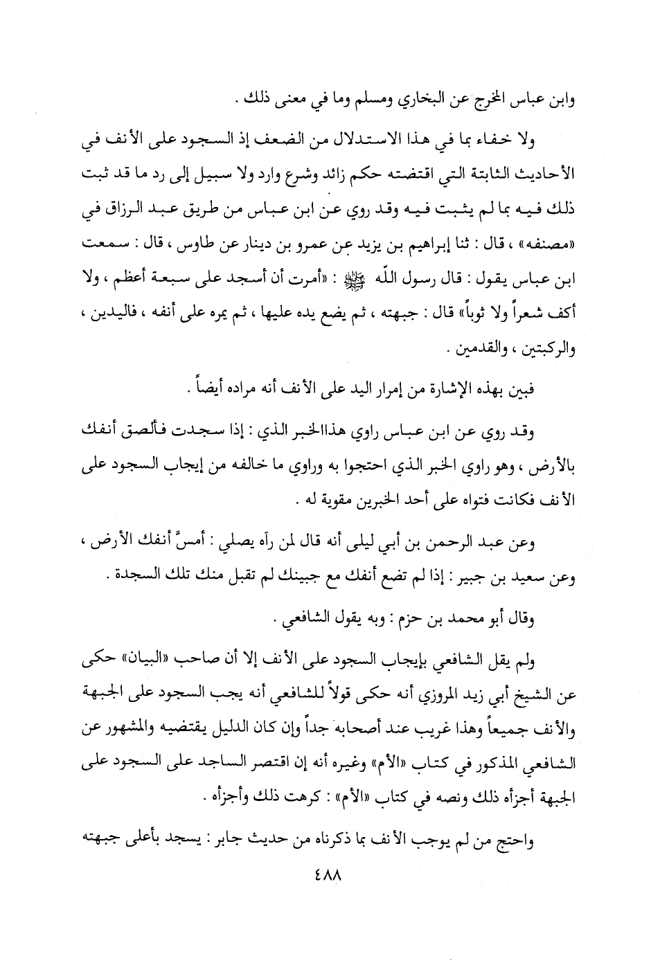 ولا خفاء بما في هذا الاستدلال من الضعف إذ السجود على الأنف في الأحاديث الثابتة التي اقتضته حكم زائد وشرع وارد ولا سبيل إلى رد ما قد ثبت ذلك فيه بما لم يثبت فيه وقد روي عن ابن عباس من طريق عبد الرزاق في "مصنفه"، قال: ثنا إبراهيم بن يزيد عن عمرو بن دينار عن طاوس، قال: سمعت ابن عباس يقول: قال رسول الله - صلى الله عليه وسلم -: "أمرت أن أسجد على سبعة أعظم، ولا أكف شعرًا ولا ثوبًا" قال: جبهته، ثم يضع يده عليها، ثم يمره على أنفه، فاليدين، والركبتين، والقدمين.
