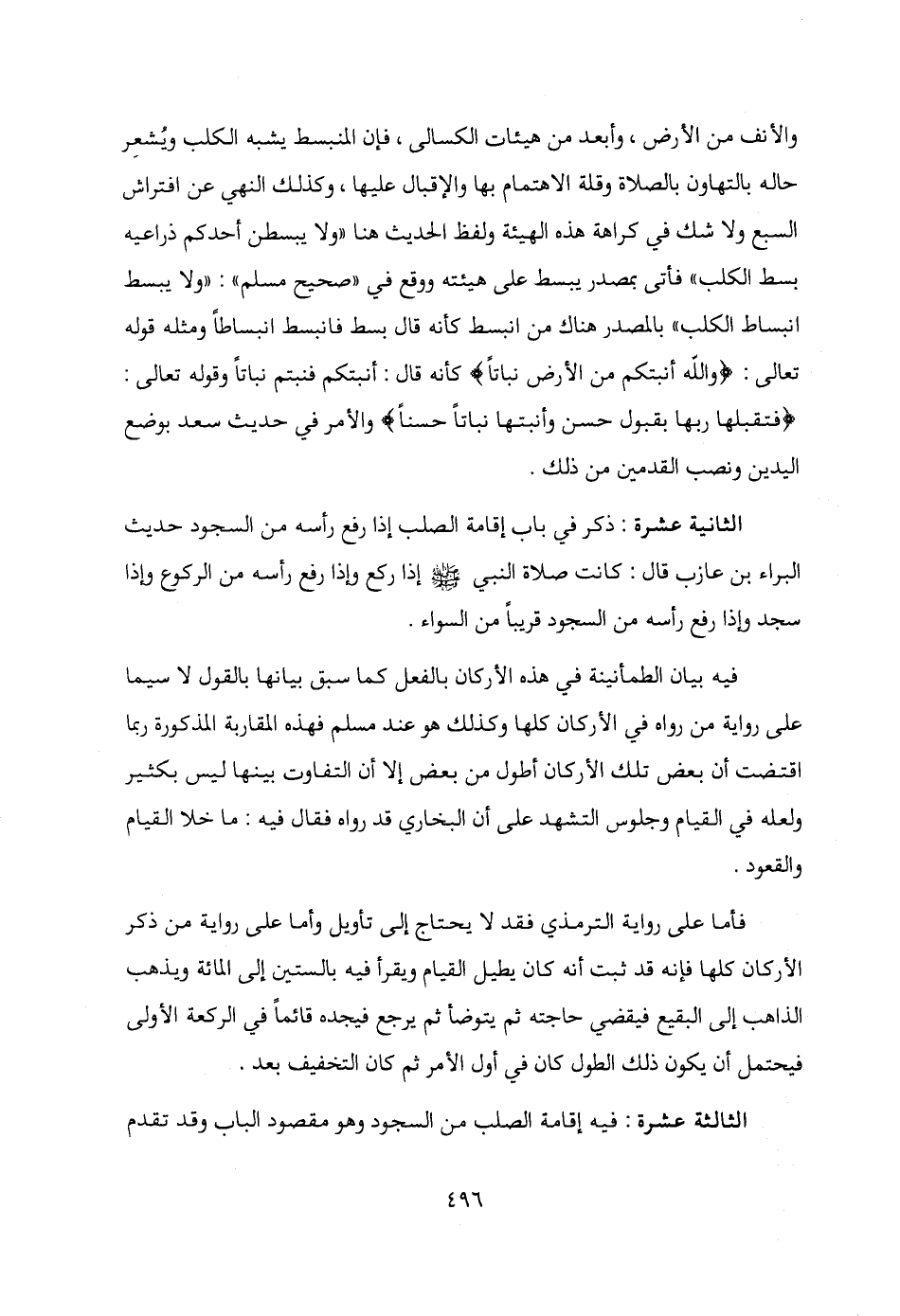 الثانية عشرة: ذكر في باب إقامة الصلب إذا رفع رأسه من السجود حديث البراء بن عازب قال: كانت صلاة النبي - صلى الله عليه وسلم - إذا ركع وإذا رفع رأسه من الركوع وإذا سجد وإذا رفع رأسه من السجود قريبًا من السواء.