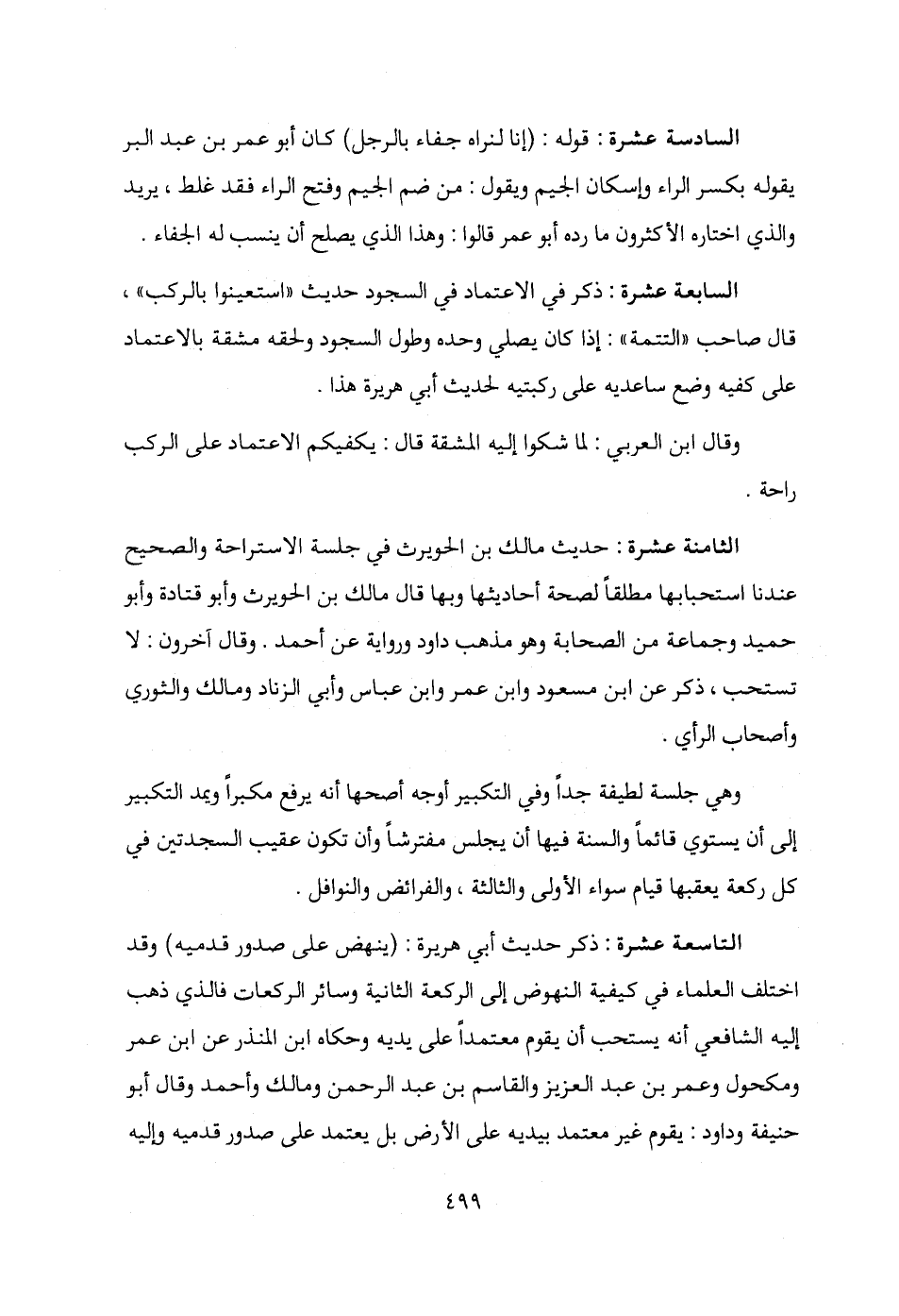 التاسعة عشرة: ذكر حديث أبي هريرة: (ينهض على صدور قدميه) وقد اختلف العلماء في كيفية النهوض إلى الركعة الثانية وسائر الركعات فالذي ذهب إليه الشافعي أنه يستحب أن يقوم معتمدًا على يديه وحكاه ابن المنذر عن ابن عمر ومكحول وعمر بن عبد العزيز والقاسم بن عبد الرحمن ومالك وأحمد وقال أبو حنيفة وداود: يقوم غير معتمد بيديه على الأرض بل يعتمد على صدور قدميه وإليه