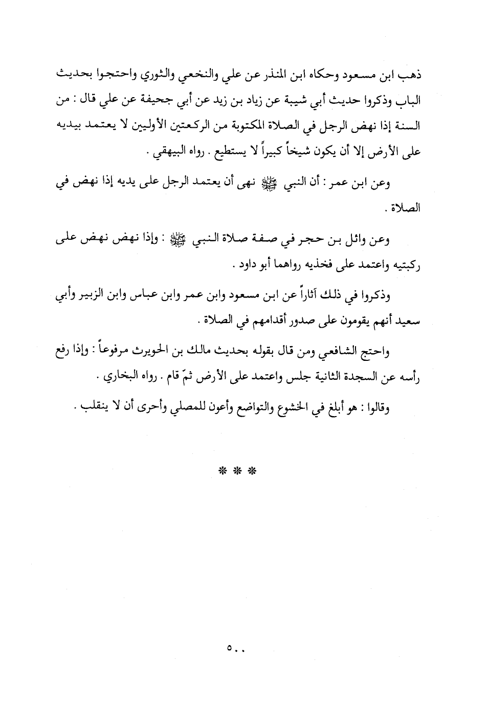 ذهب ابن مسعود وحكاه ابن المنذر عن علي والنخعي والثوري واحتجوا بحديث الباب وذكروا حديث أبي شيبة عن زياد بن زيد عن أبي جحيفة عن علي قال: من السنة إذا نهض الرجل في الصلاة المكتوبة من الركعتين الأوليين لا يعتمد بيديه على الأرض إلا أن يكون شيخًا كبيرًا لا يستطيع. رواه البيهقي.