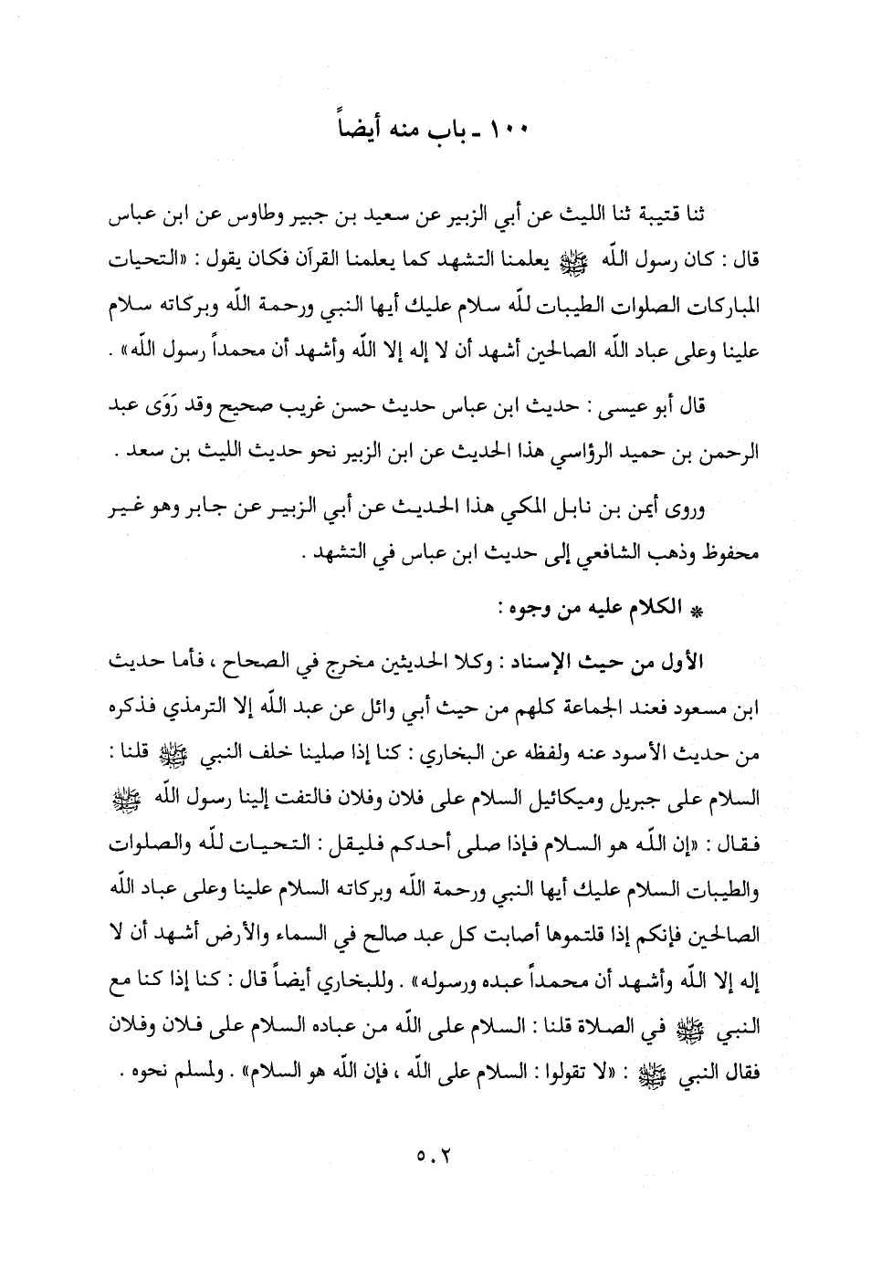 ثنا قتيبة ثنا الليث عن أبي الزبير عن سعيد بن جبير وطاوس عن ابن عباس قال: كان رسول الله - صلى الله عليه وسلم - يعلمنا التشهد كما يعلمنا القرآن فكان يقول: "التحيات المباركات الصلوات الطيبات لله سلام عليك أيها النبي ورحمة الله وبركاته سلام علينا وعلى عباد الله الصالحين أشهد أن لا إله إلا الله وأشهد أن محمدًا رسول الله".