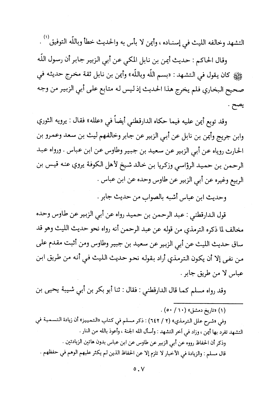 وفي "شرح علل الترمذي" (2/ 642): ذكر مسلم في كتاب "التمييز" أن زيادة التسمية في التشهد تفرد بها أيمن، وزاد في آخر التشهد: وأسأل الله الجنة، وأعوذ بالله من النار.