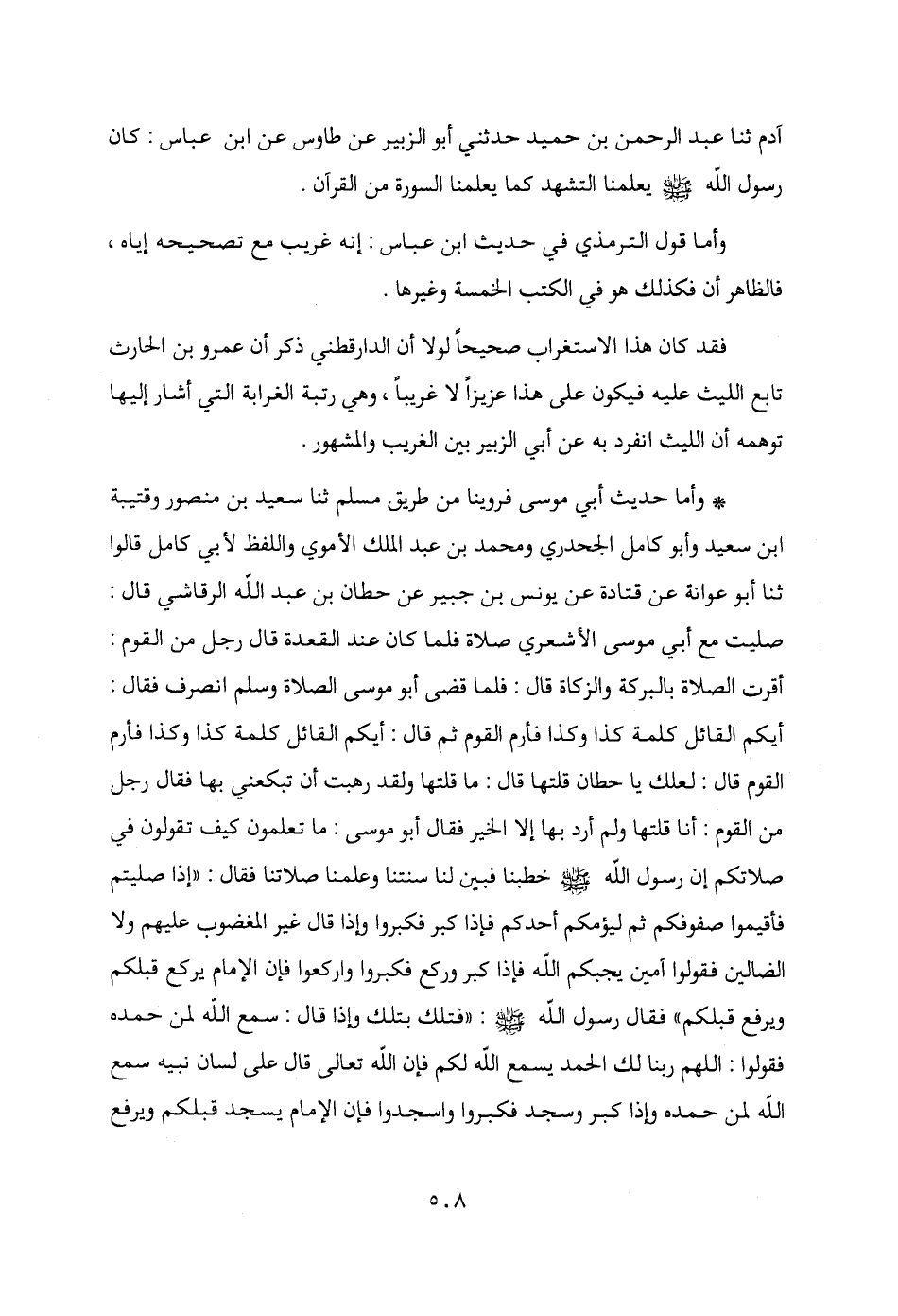 * وأما حديث أبي موسى فروينا من طريق مسلم ثنا سعيد بن منصور وقتيبة بن سعيد وأبو كامل الجحدري ومحمد بن عبد الملك الأموي واللفظ لأبي كامل قالوا ثنا أبو عوانة عن قتادة عن يونس بن جبير عن حطان بن عبد الله الرقاشي قال: صليت مع أبي موسى الأشعري صلاة فلما كان عند القعدة قال رجل من القوم: أقرت الصلاة بالبركة والزكاة قال: فلما قضى أبو موسى الصلاة وسلم انصرف فقال: أيكم القائل كلمة كذا وكذا فأرم القوم ثم قال: أيكم القائل كلمة كذا وكذا فأرم القوم قال: لعلك يا حطان قلتها قال: ما قلتها ولقد رهبت أن تبكعني بها فقال رجل من القوم: أنا قلتها ولم أرد بها إلا الخير فقال أبو موسى: ما تعلمون كيف تقولون في صلاتكم إن رسول الله - صلى الله عليه وسلم - خطبنا فبين لنا سنتنا وعلمنا صلاتنا فقال: "إذا صليتم فأقيموا صفوفكم ثم ليؤمكم أحدكم فإذا كبر فكبروا وإذا قال غير المغضوب عليهم ولا الضالين فقولوا آمين يجبكم الله فإذا كبر وركع فكبروا واركعوا فإن الإمام يركع قبلكم ويرفع قبلكم" فقال رسول الله - صلى الله عليه وسلم -: "فتلك بتلك وإذا قال: سمع الله لمن حمده فقولوا: اللهم ربنا لك الحمد يسمع الله لكم فإن الله تعالى قال على لسان نبيه سمع الله لمن حمده وإذا كبر وسجد فكبروا واسجدوا فإن الإمام يسجد قبلكم ويرفع