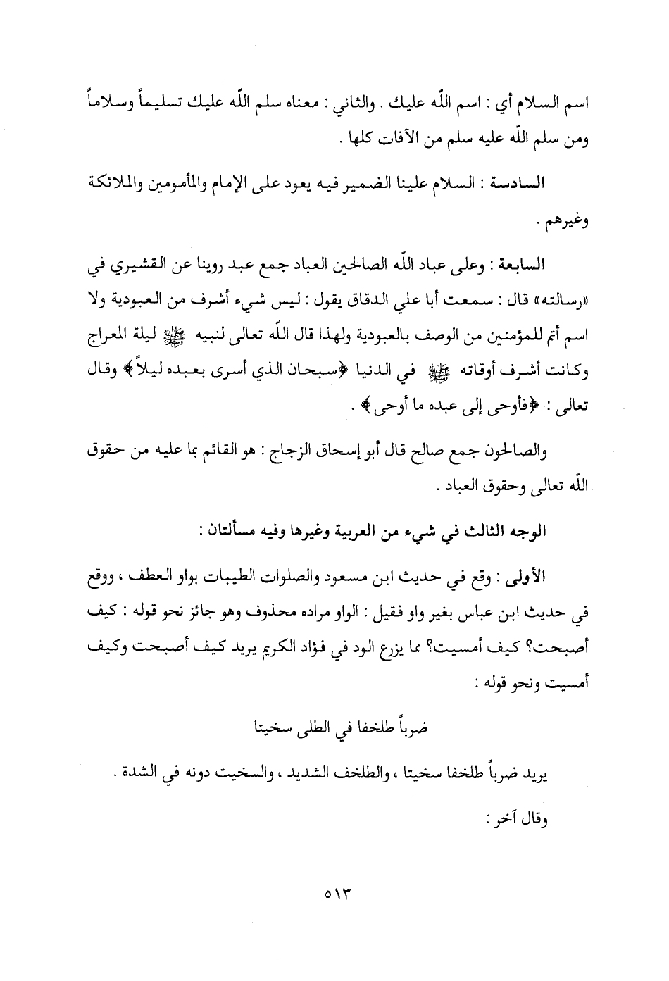السابعة: وعلى عباد الله الصالحين العباد جمع عبد روينا عن القشيري في "رسالته" قال: سمعت أبا علي الدقاق يقول: ليس شيء أشرف من العبودية ولا اسم أتم للمؤمنين من الوصف بالعبودية ولهذا قال الله تعالى لنبيه - صلى الله عليه وسلم - ليلة المعراج وكانت أشرف أوقاته - صلى الله عليه وسلم - في الدنيا {سبحان الذي أسرى بعبده ليلًا} وقال تعالى: {فأوحى إلى عبده ما أوحى}.