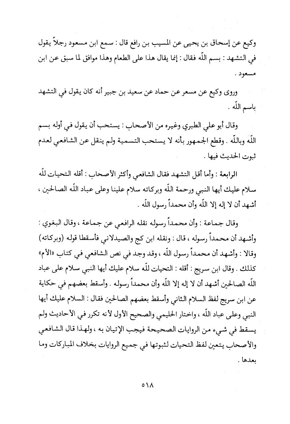 وقال جماعة: وأن محمدًا رسوله نقله الرافعي عن جماعة، وقال البغوي: وأشهد أن محمدًا رسوله، قال: ونقله ابن كج والصيدلاني فأسقطا قوله (وبركاته) وقالا: وأشهد أن محمدًا رسول الله، وقد وجد في نص الشافعي في كتاب "الأم" كذلك. وقال ابن سريج: أقله: التحيات لله سلام عليك أيها النبي سلام على عباد الله الصالحين أشهد أن لا إله إلا الله وأن محمدًا رسوله. وأسقط بعضهم في حكاية عن ابن سريج لفظ السلام الثاني وأسقط بعضهم الصالحين فقال: السلام عليك أيها النبي وعلى عباد الله، واختار الحليمي والصحيح الأول لأنه تكرر في الأحاديث ولم يسقط في شيء من الروايات الصحيحة فيجب الإتيان به، ولهذا قال الشافعي والأصحاب يتعين لفظ التحيات لثبوتها في جميع الروايات بخلاف المباركات وما بعدها.