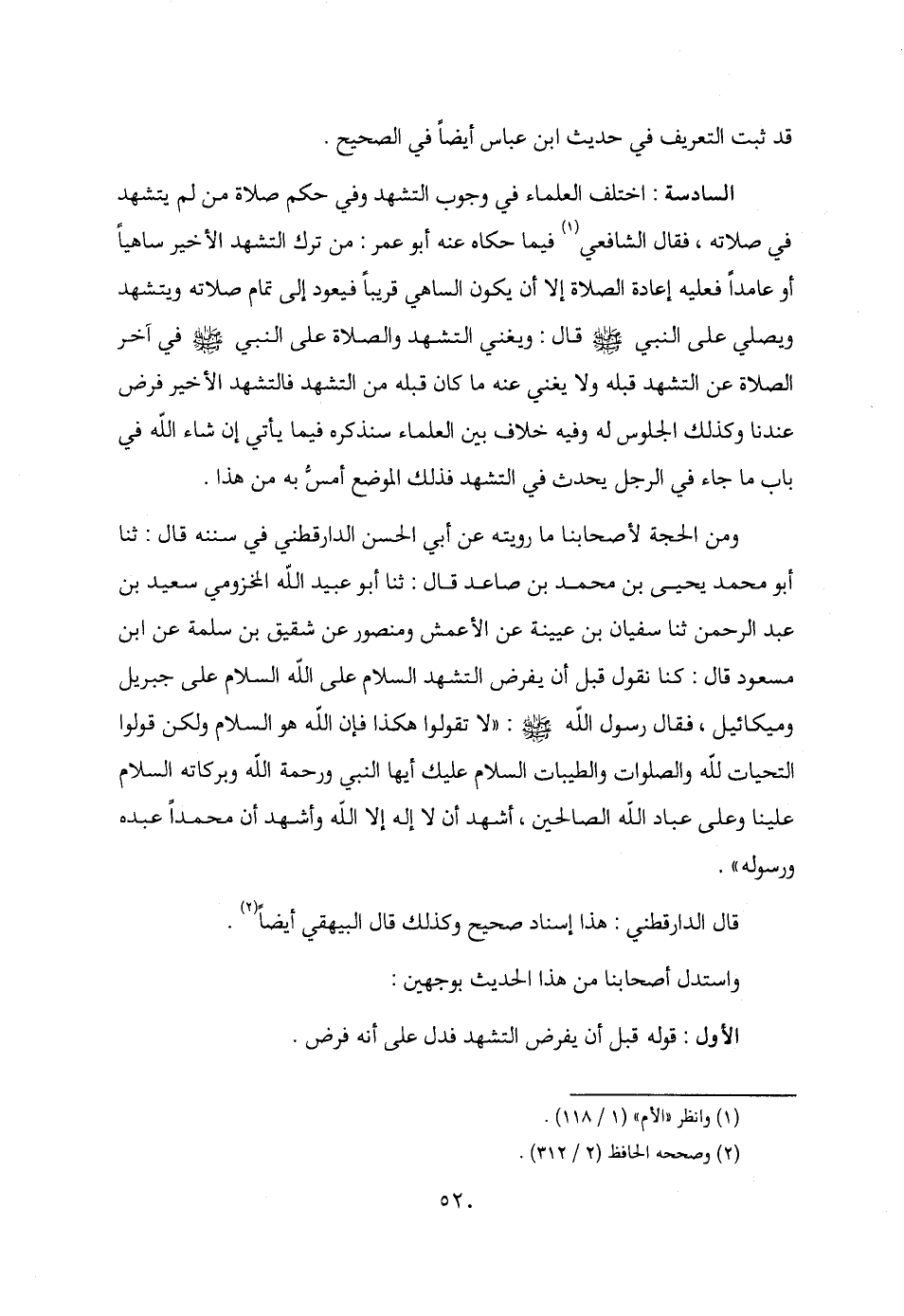 ومن الحجة لأصحابنا ما رويته عن أبي الحسن الدارقطني في سننه قال: ثنا أبو محمد يحيى بن محمد بن صاعد قال: ثنا أبو عبيد الله المخزومي سعيد بن عبد الرحمن ثنا سفيان بن عيينة عن الأعمش ومنصور عن شقيق بن سلمة عن ابن مسعود قال: كنا نقول قبل أن يفرض التشهد السلام على الله السلام على جبريل وميكائيل، فقال رسول الله - صلى الله عليه وسلم -: "لا تقولوا هكذا فإن الله هو السلام ولكن قولوا التحيات لله والصلوات والطيبات السلام عليك أيها النبي ورحمة الله وبركاته السلام علينا وعلى عباد الله الصالحين، أشهد أن لا إله إلا الله وأشهد أن محمدًا عبده ورسوله".